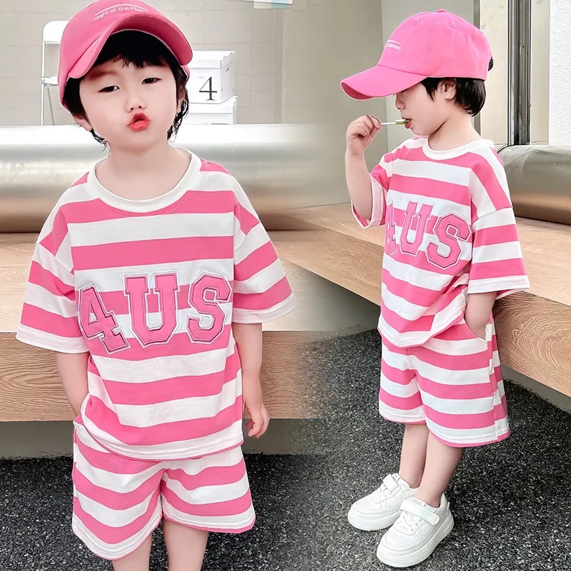 夏季男女童条纹套装新款中小童短袖宽松上衣五分裤儿童运动服