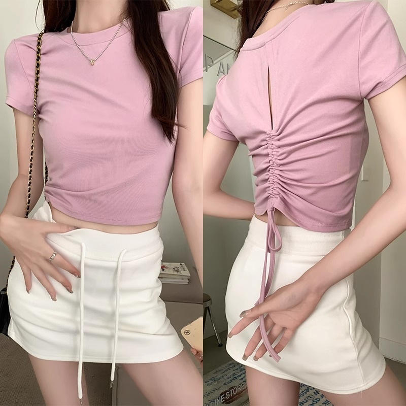 亿涵梦法式夏季甜辣妹圆领抽皱多巴胺纯色上衣女百搭镂空抽绳T恤