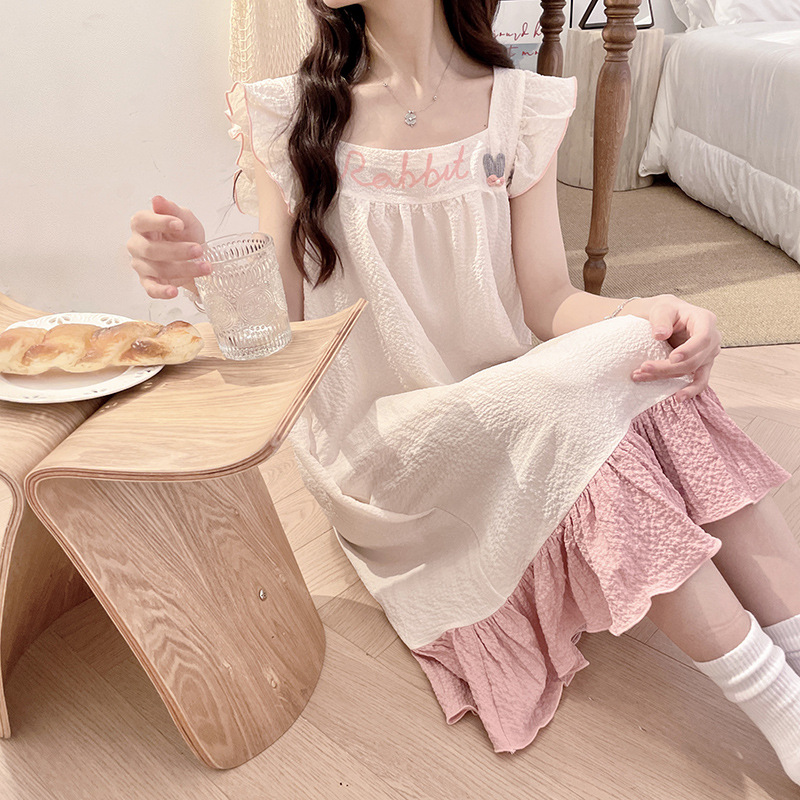 泡泡棉睡裙女夏季小飞袖吊带中长款方领花边甜美少女家居服薄