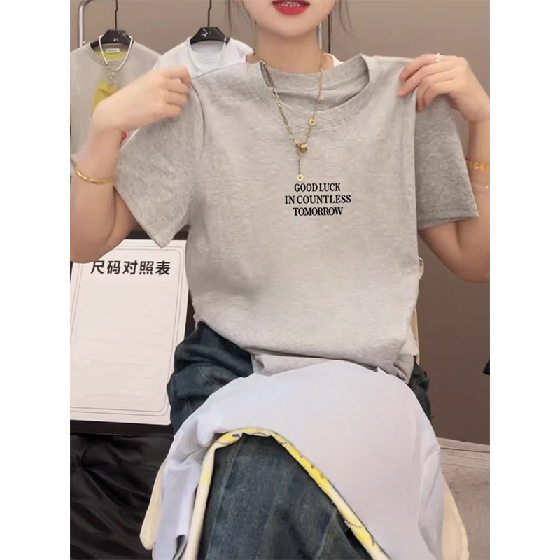 正肩纯棉短袖t恤女士2025新款爆款时尚百搭休闲灰色上衣夏季潮