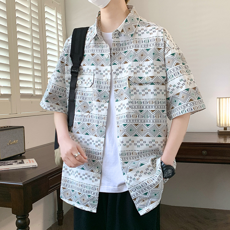 百搭日系夏季新款短袖衬衫青年休闲民族风衬衫男