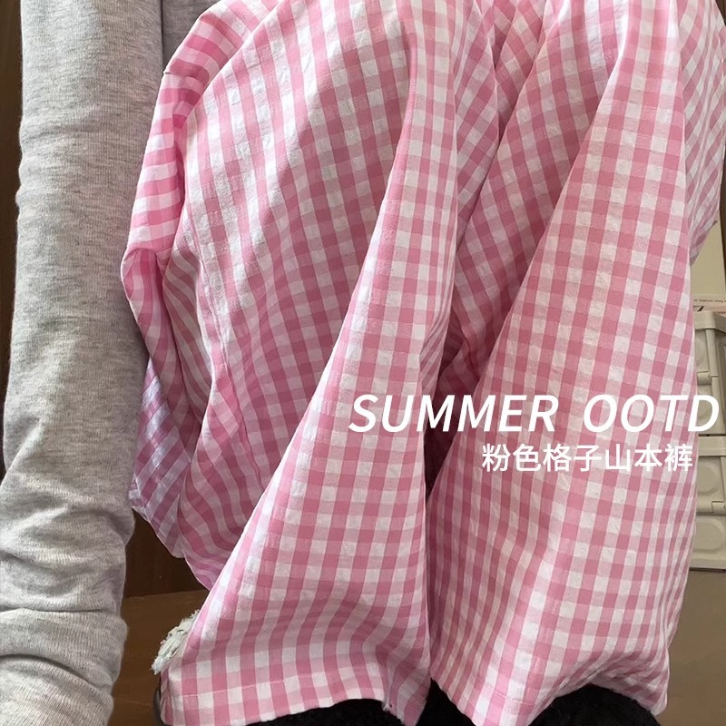 粉色格子阔腿裤女夏季薄款新款高腰垂感休闲遛弯山本直筒裤