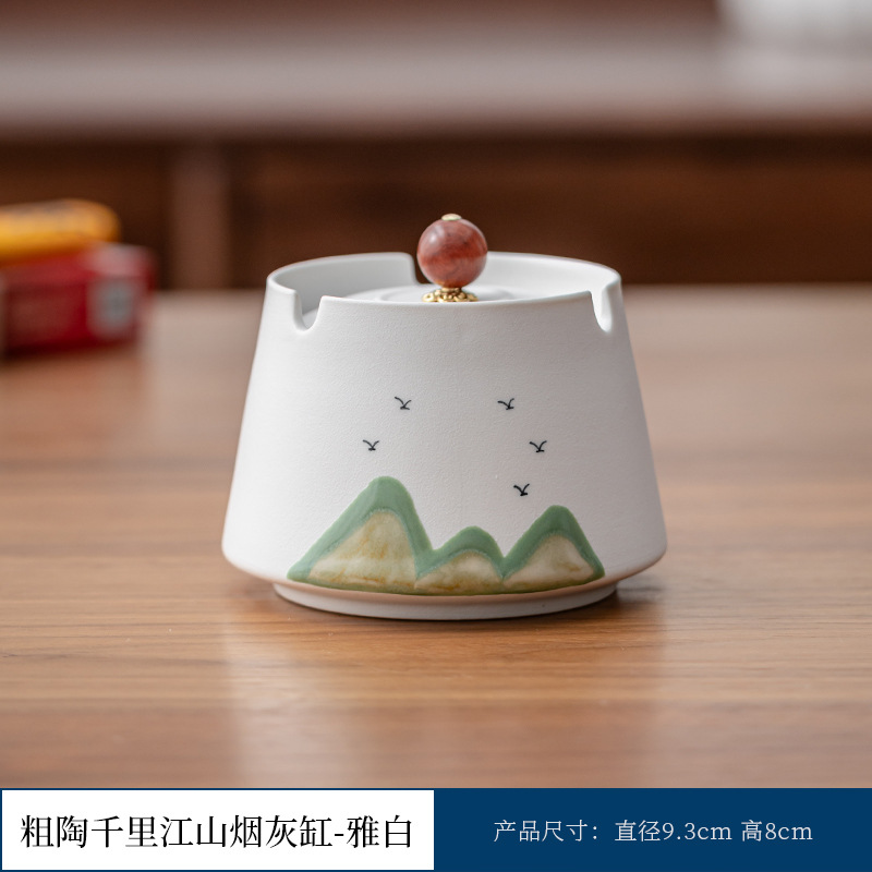 粗陶千里江山有盖烟灰缸-雅白