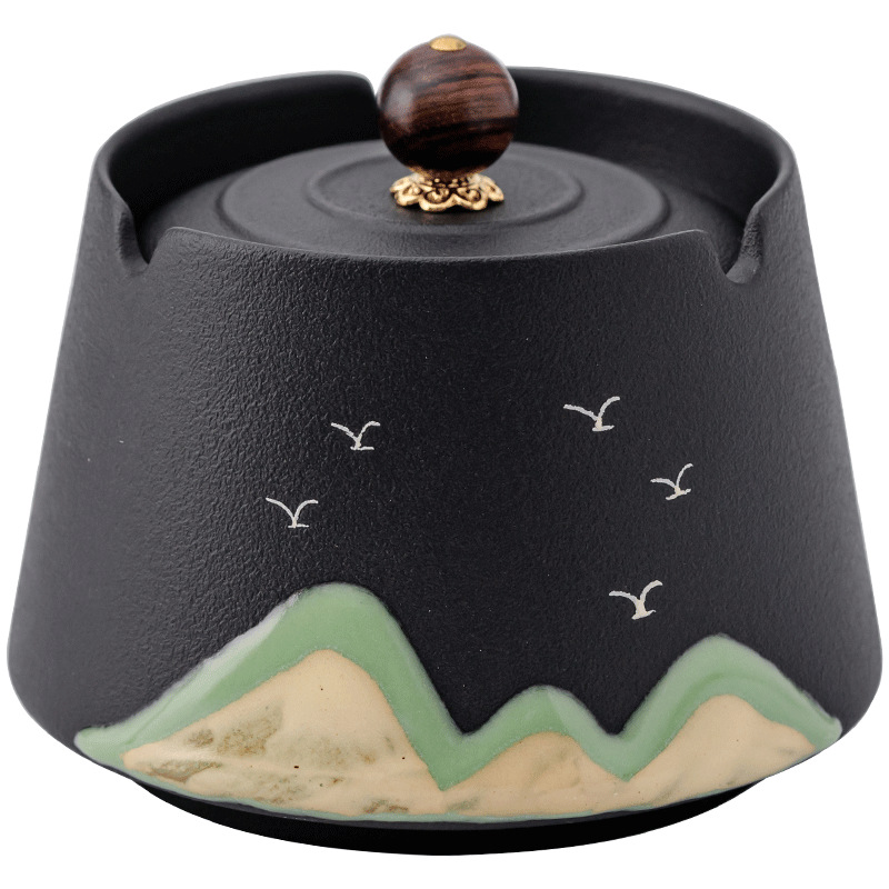 粗陶千里江山有盖烟灰缸-禅黑