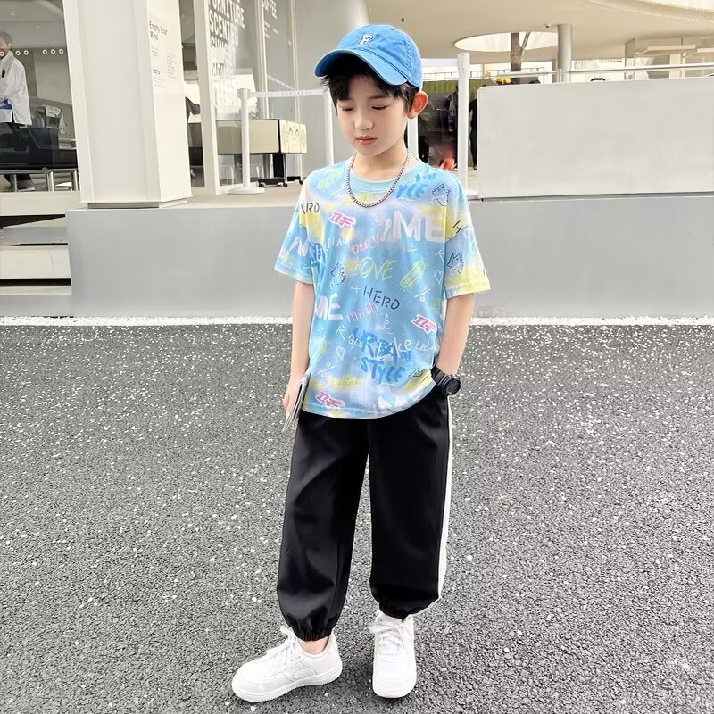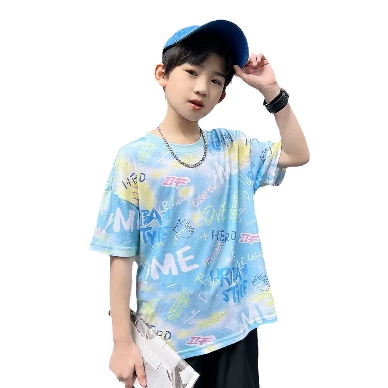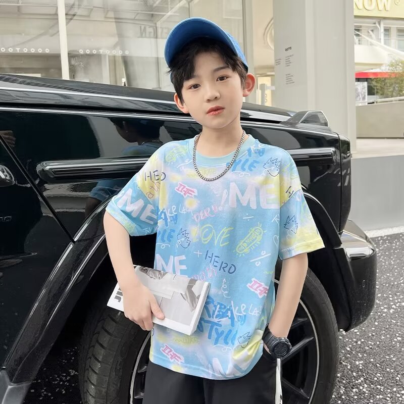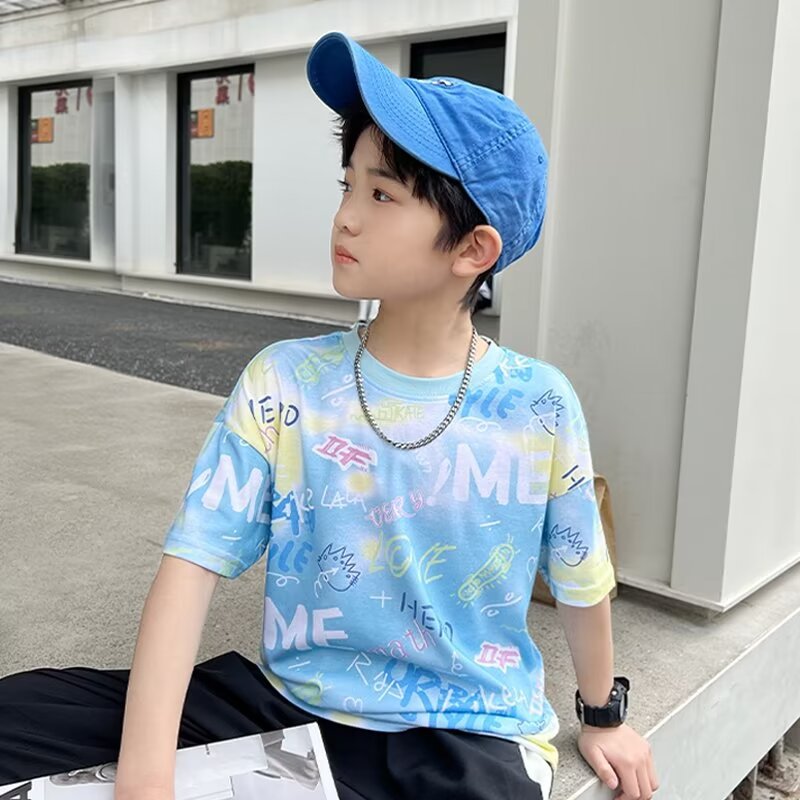 童装男童短袖T恤纯棉扎染宽松夏季新款儿童字母半袖上衣中大童潮
