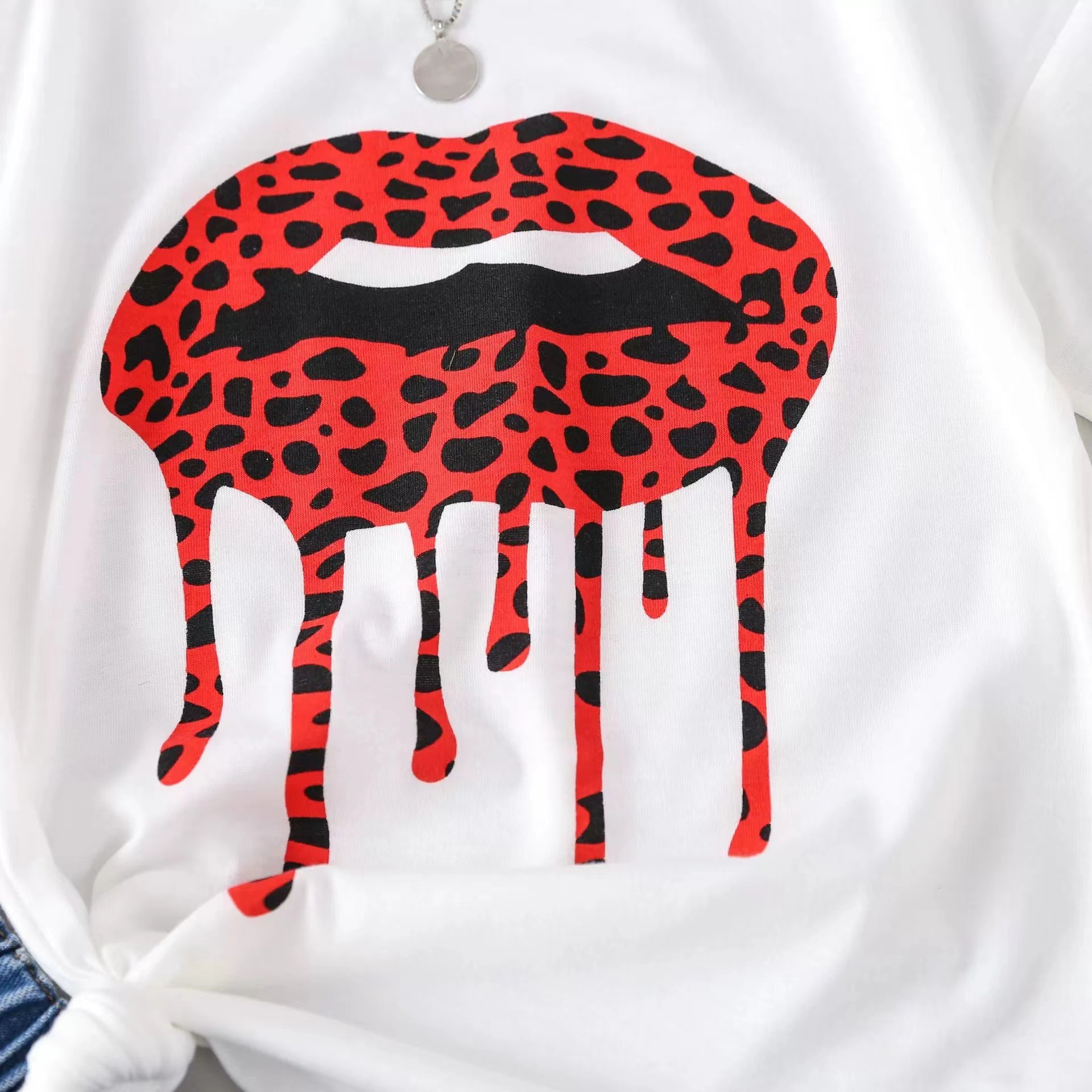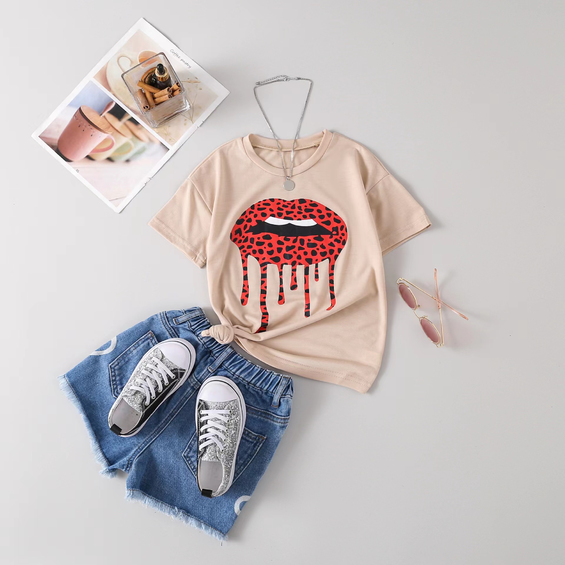 外贸童装女童韩版洋气豹纹嘴唇纯棉短袖中小童时尚休闲T恤潮跨境