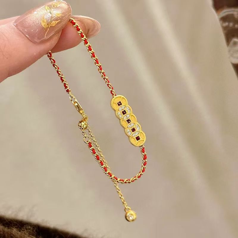 小红书爆款中国风金色五帝钱红绳编织绳手链招财福禄小金葫芦手绳