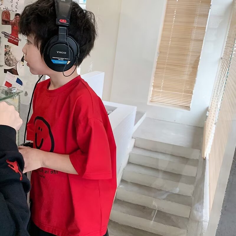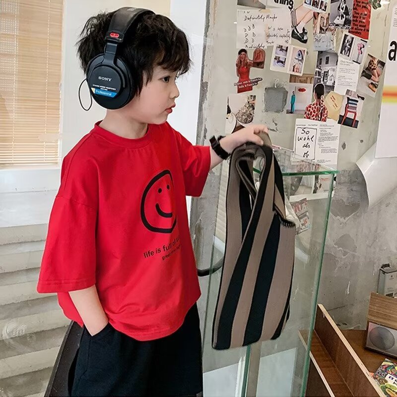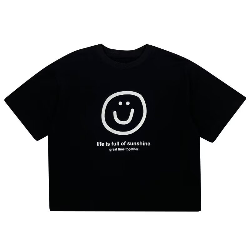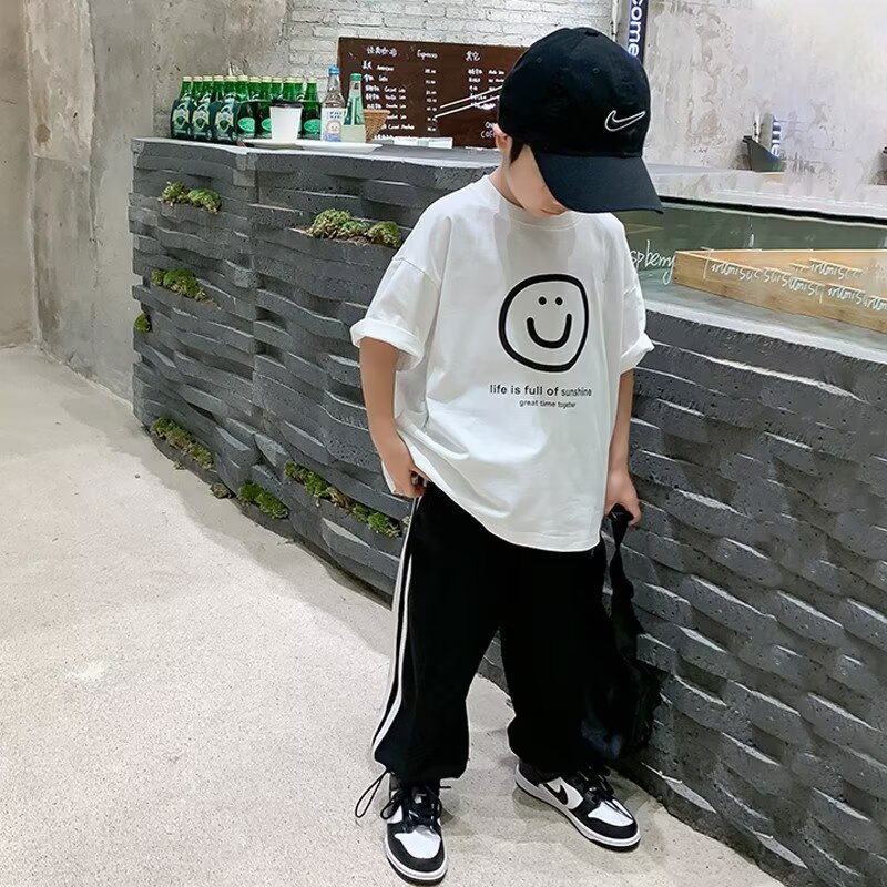 童装港风夏季字母印花休闲短袖T恤打底衫男女童笑脸半袖上衣