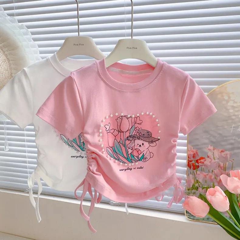 圆领女宝宝抽绳上衣夏季新款女童珍珠爱心甜美卡通印花短袖T恤潮