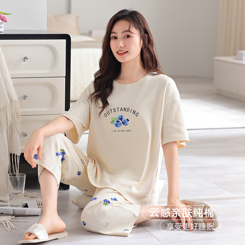 纯棉睡衣女士夏季短袖七分裤休闲圆领可外穿全棉家居服新款