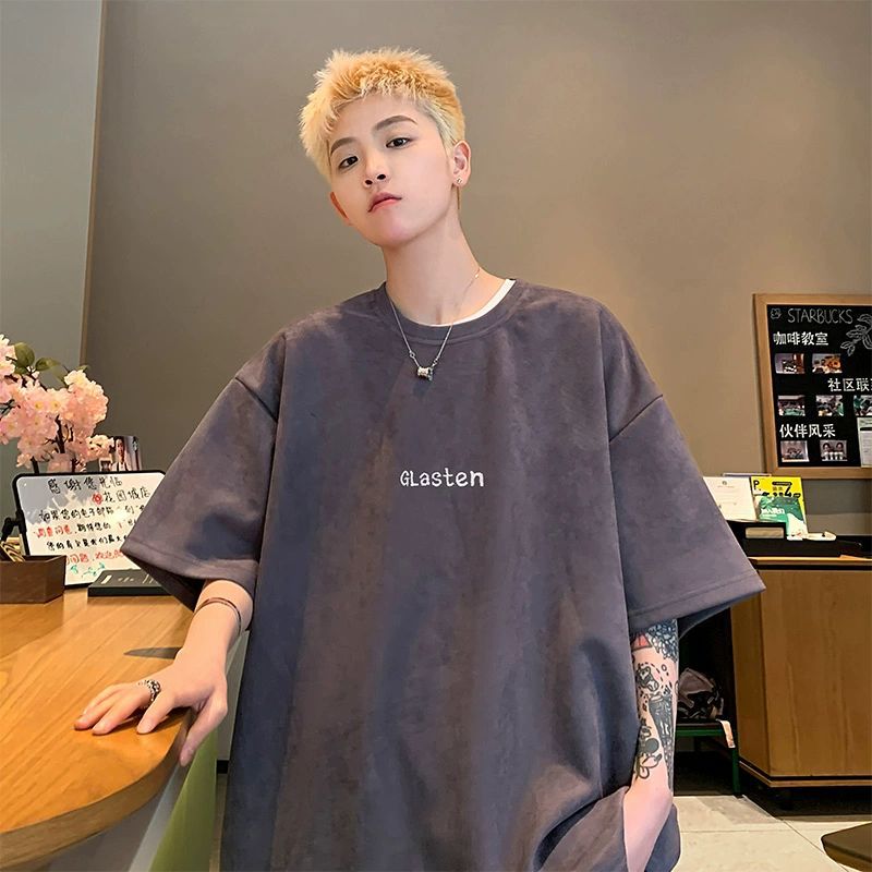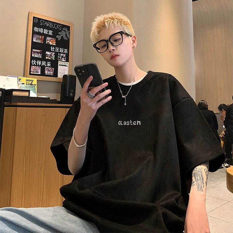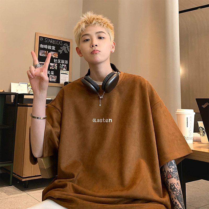 基础白色重磅麂皮绒男t恤夏季百搭美式三本针短袖潮牌七分体恤男