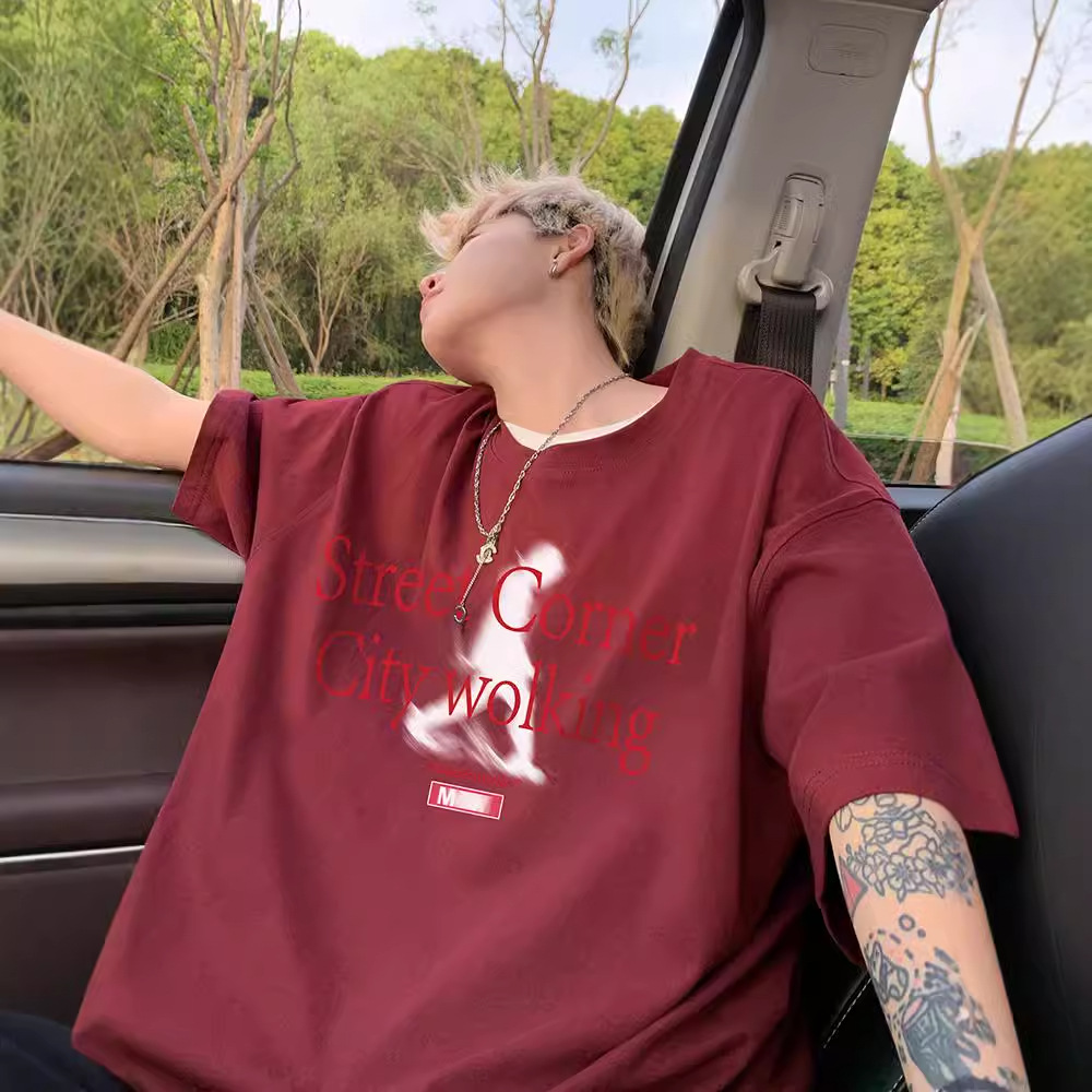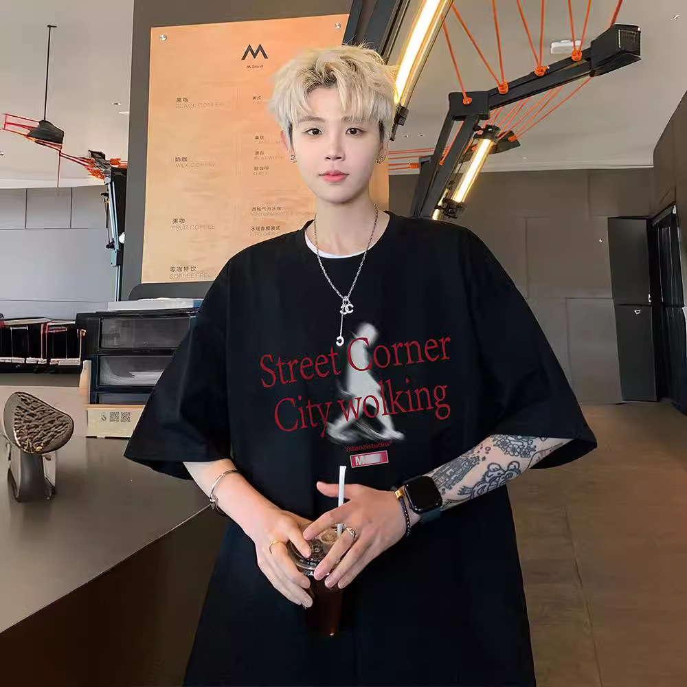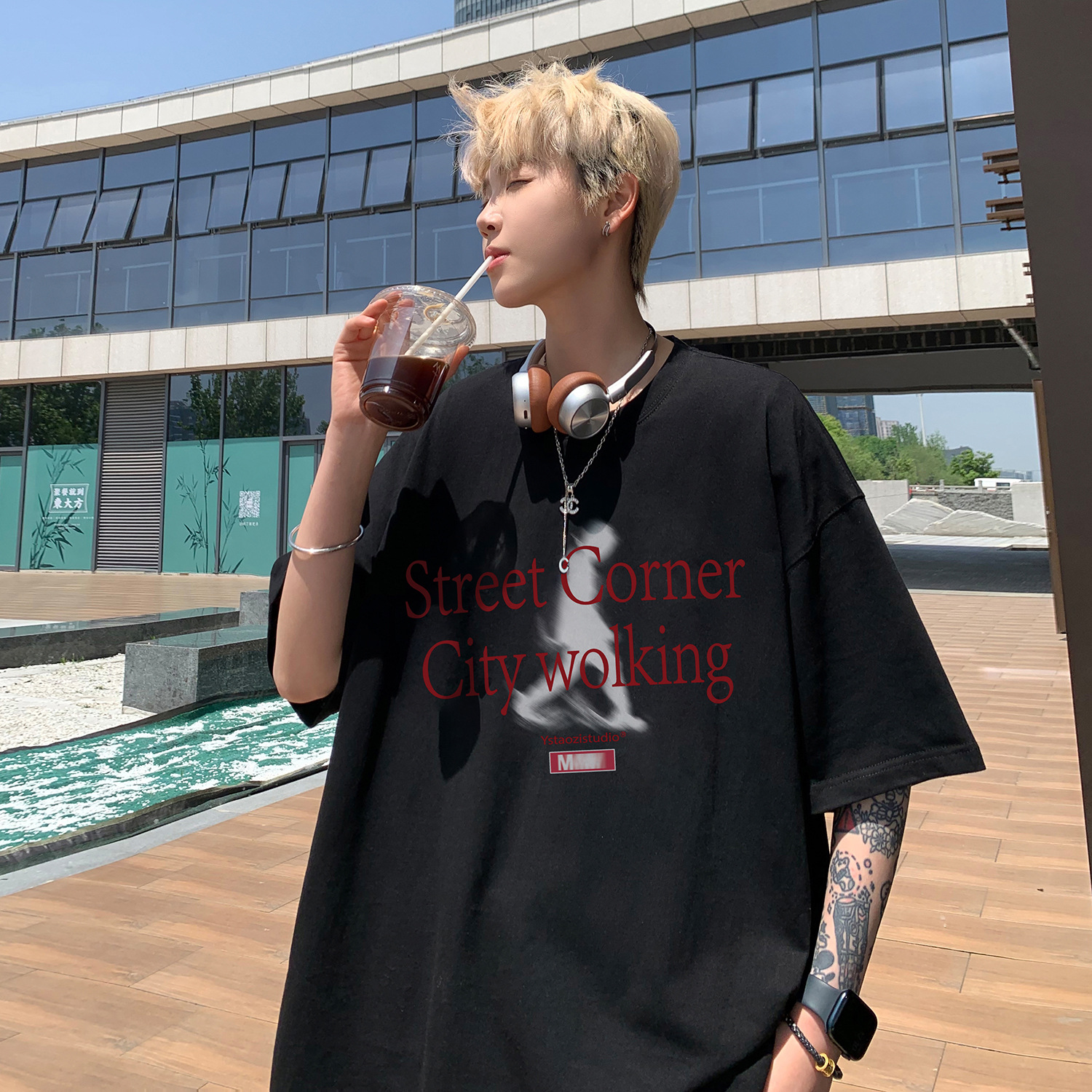 潮牌美式高街重磅短袖T恤男夏季设计感小众潮流宽松七分半袖衣服