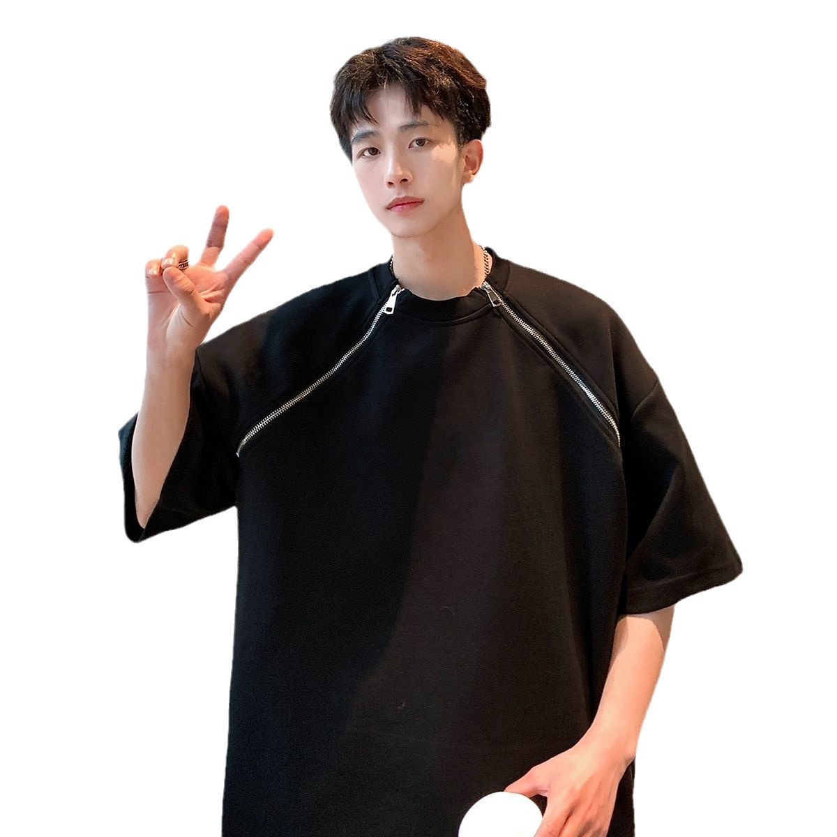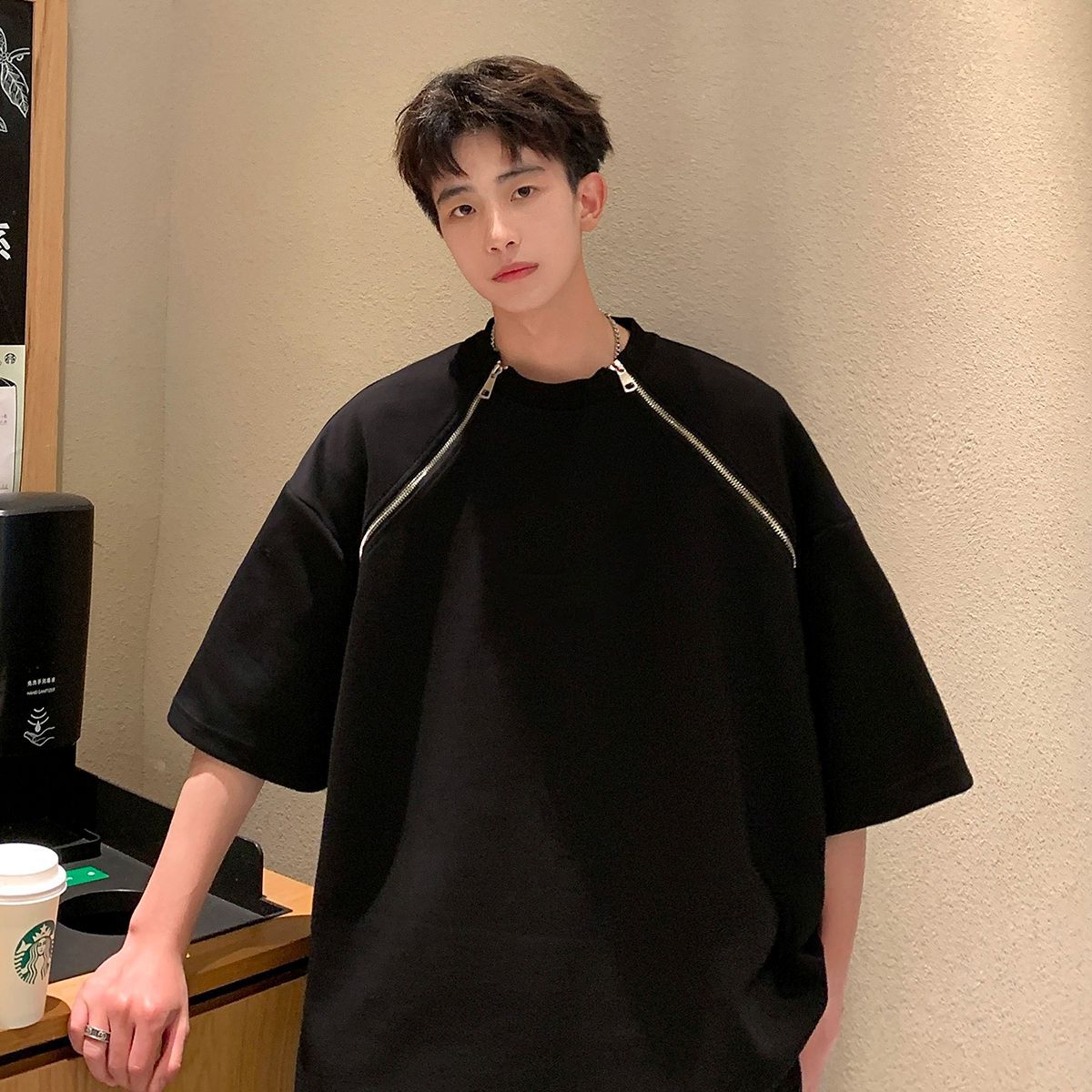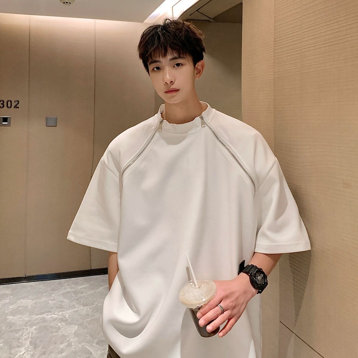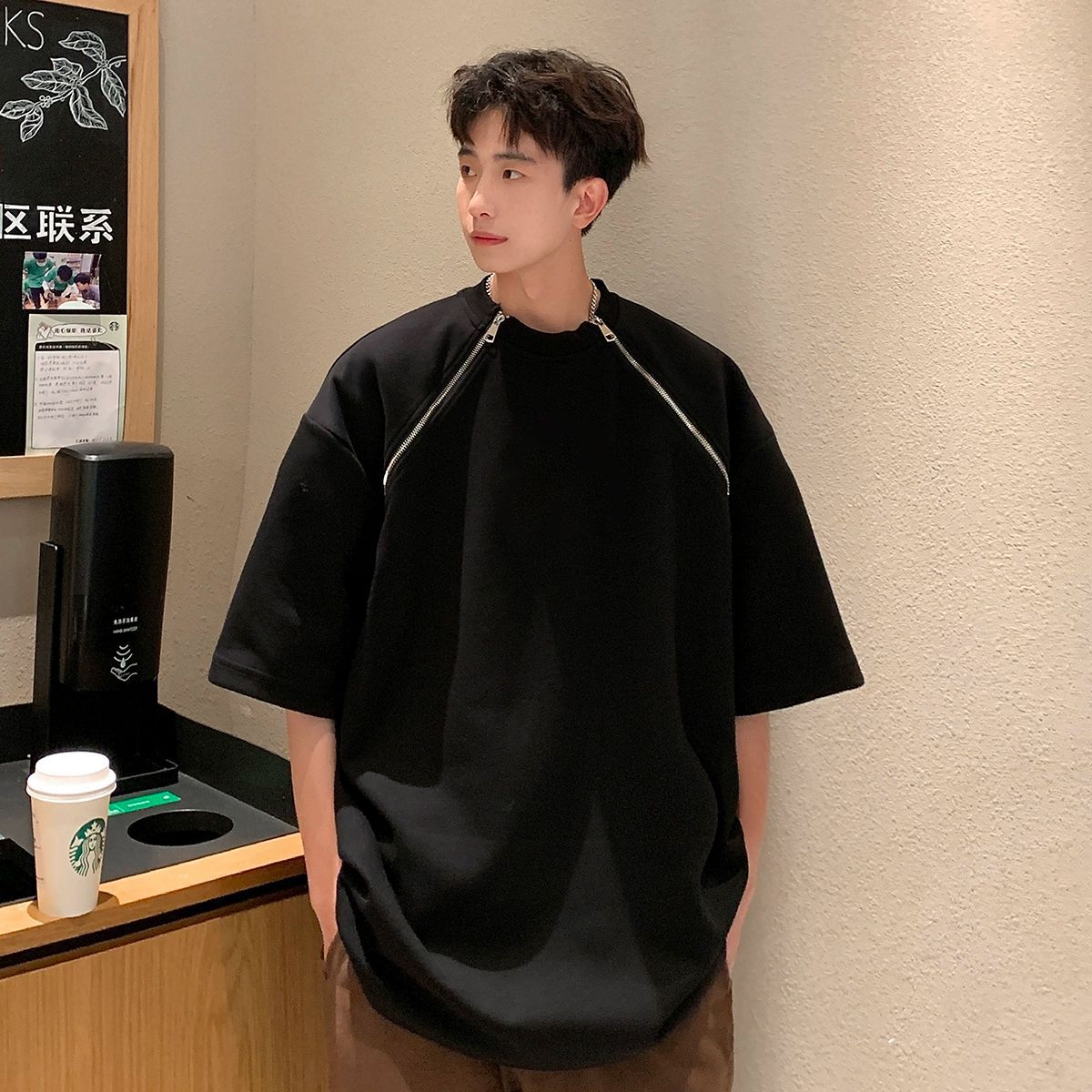 双拉链小领口t恤男款320g重磅短袖设计感小众美式复古大码七分袖