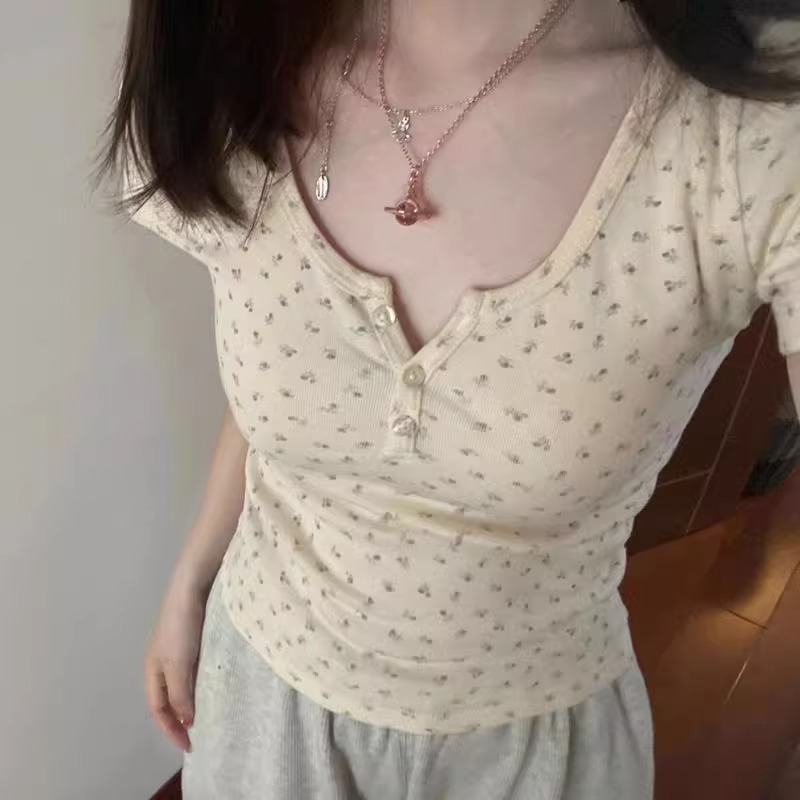 小个子减龄甜欲漂亮纽扣U领露锁骨正肩短款短袖夏女公主风潮