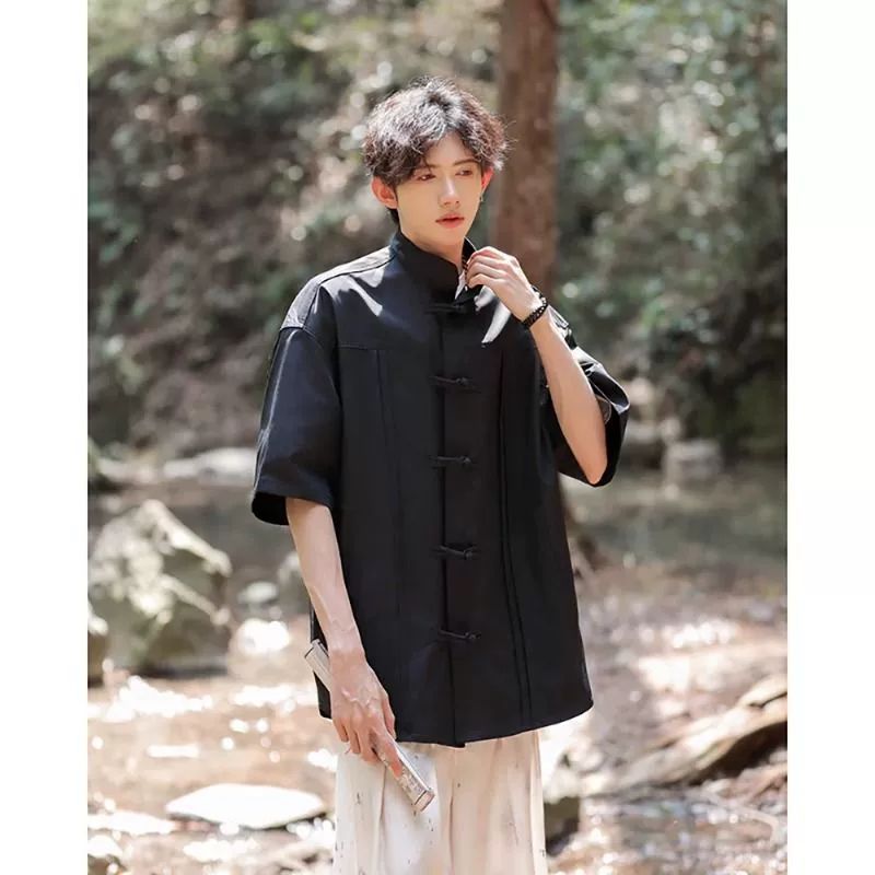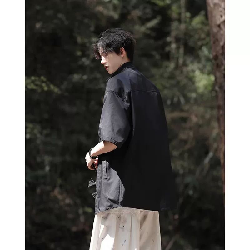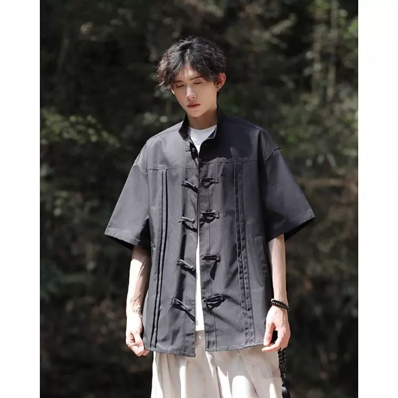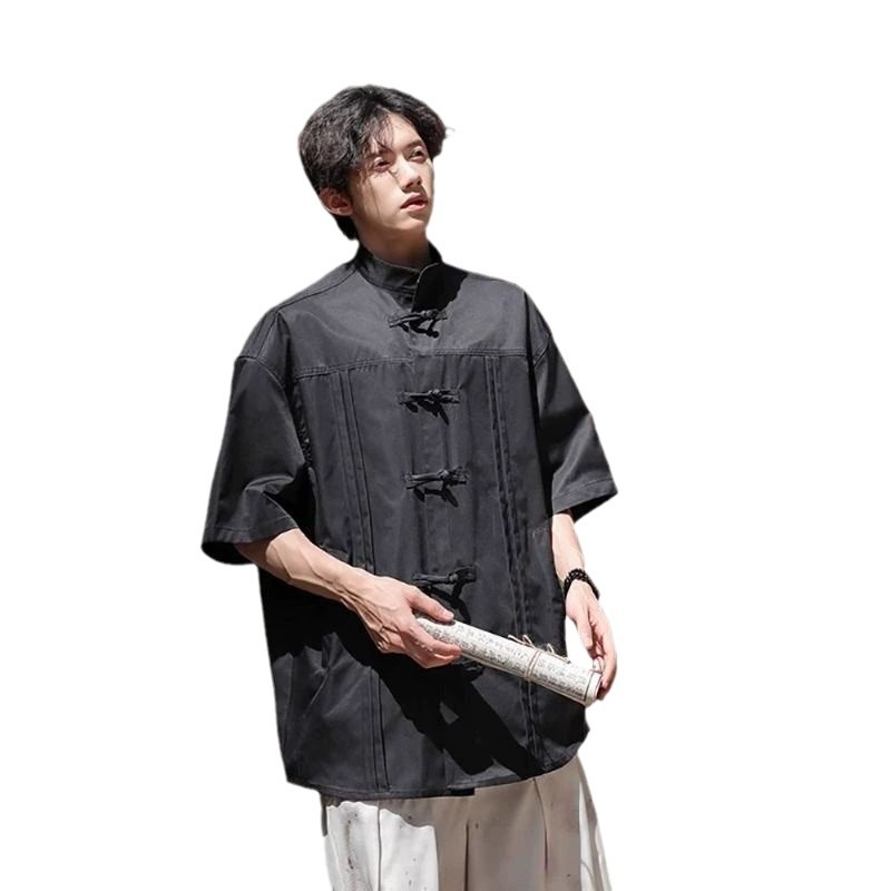 新中式国风短袖衬衫男夏季薄款潮牌复古宽松休闲盘扣半袖衬衣