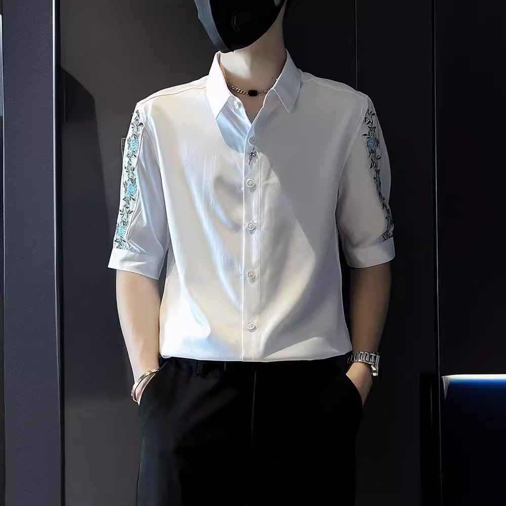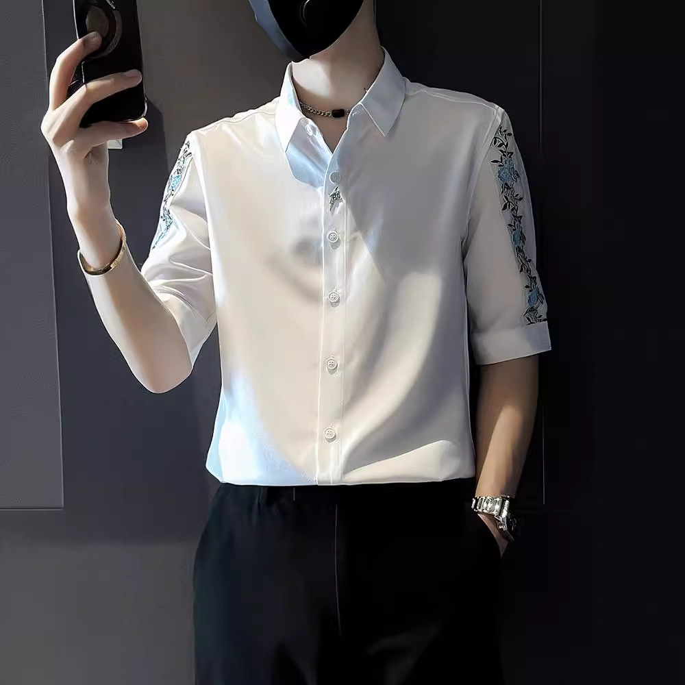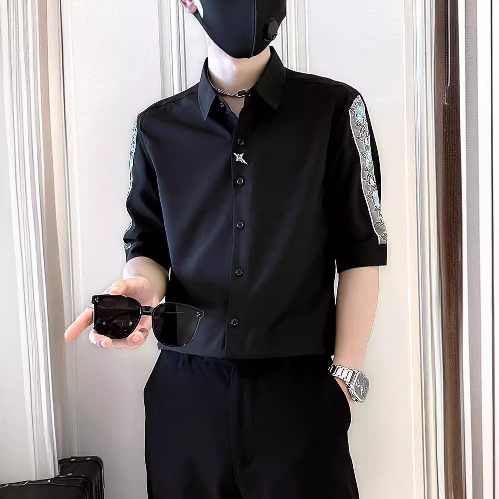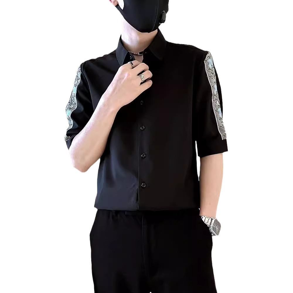 黑色衬衫短袖男夏季潮牌修身痞帅刺绣衬衣新款男士五分袖寸衫