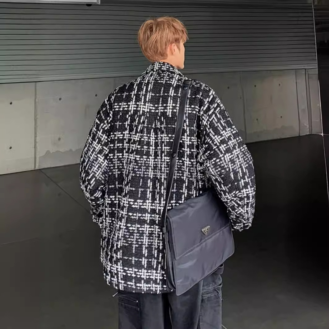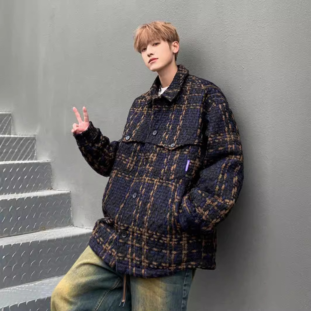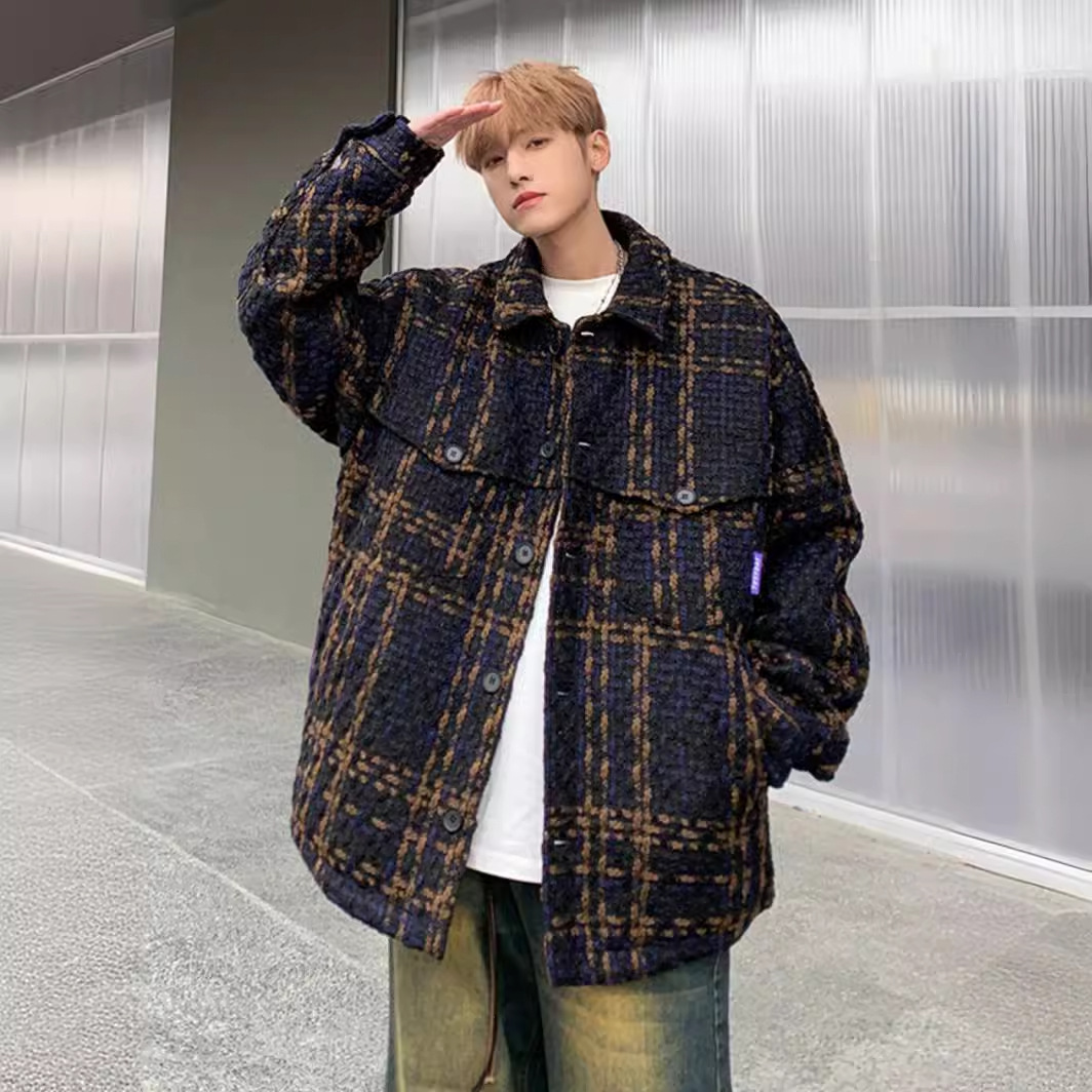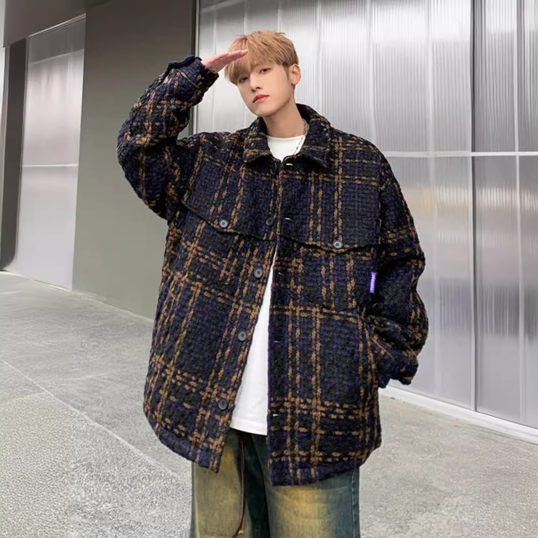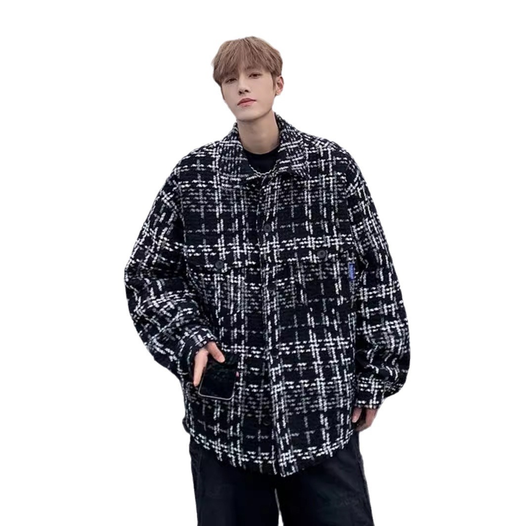 日系复古格子衬衫男春秋新款小香风宽松休闲百搭翻领长袖外套