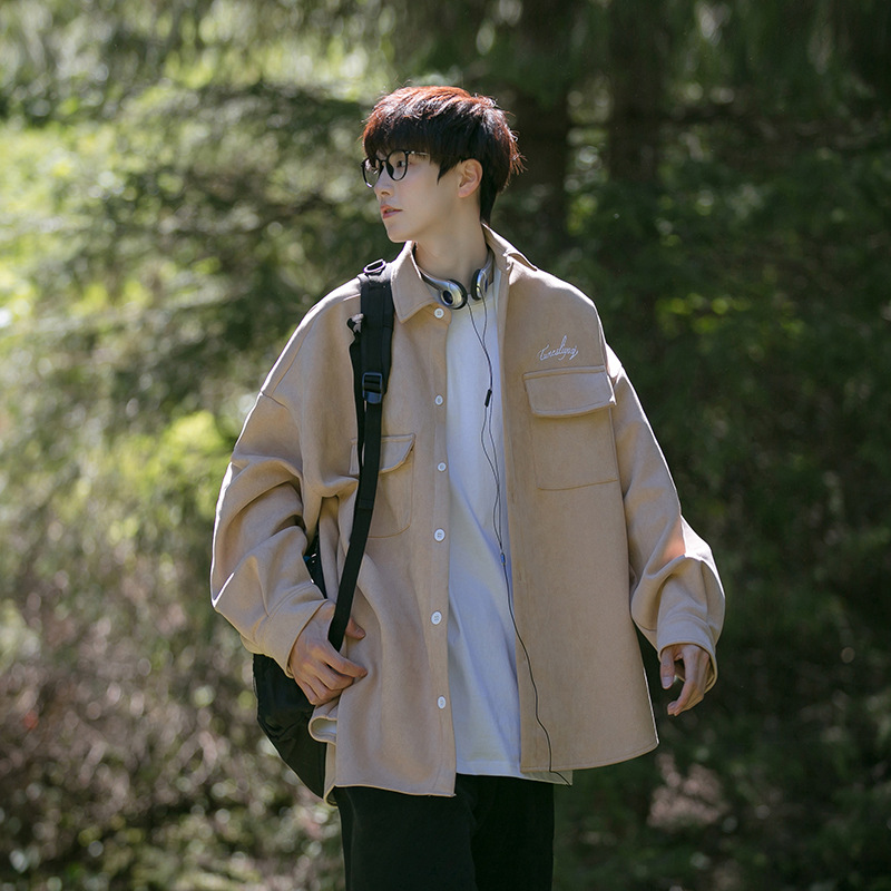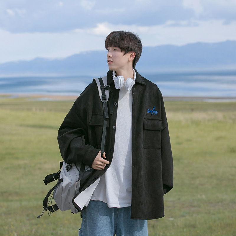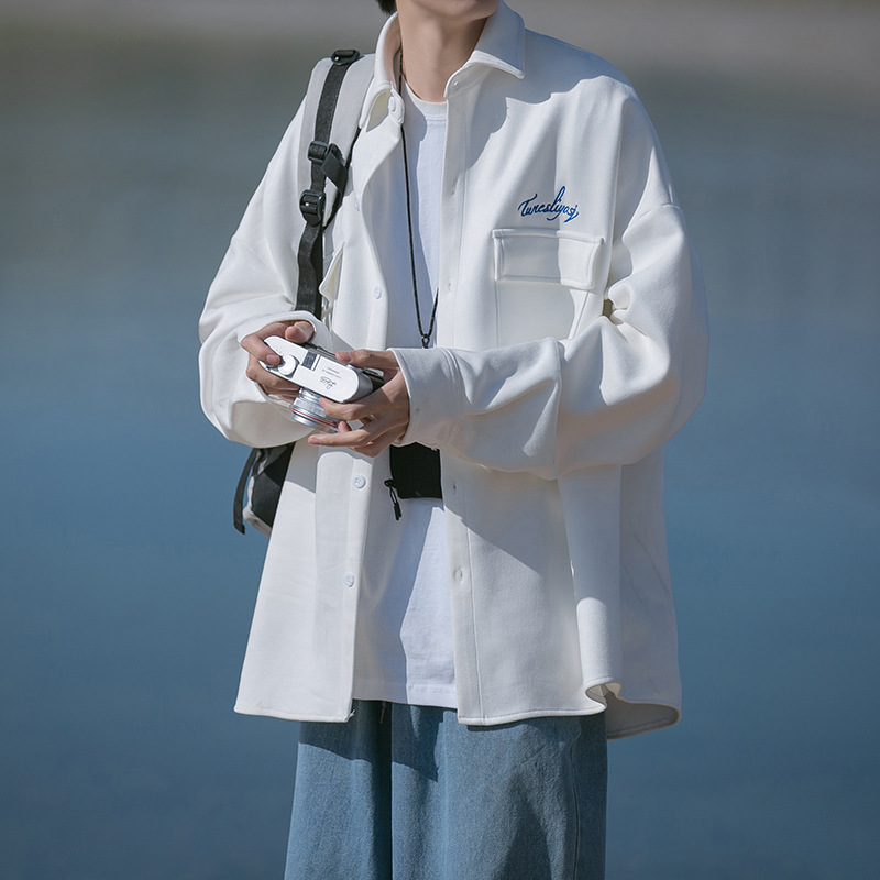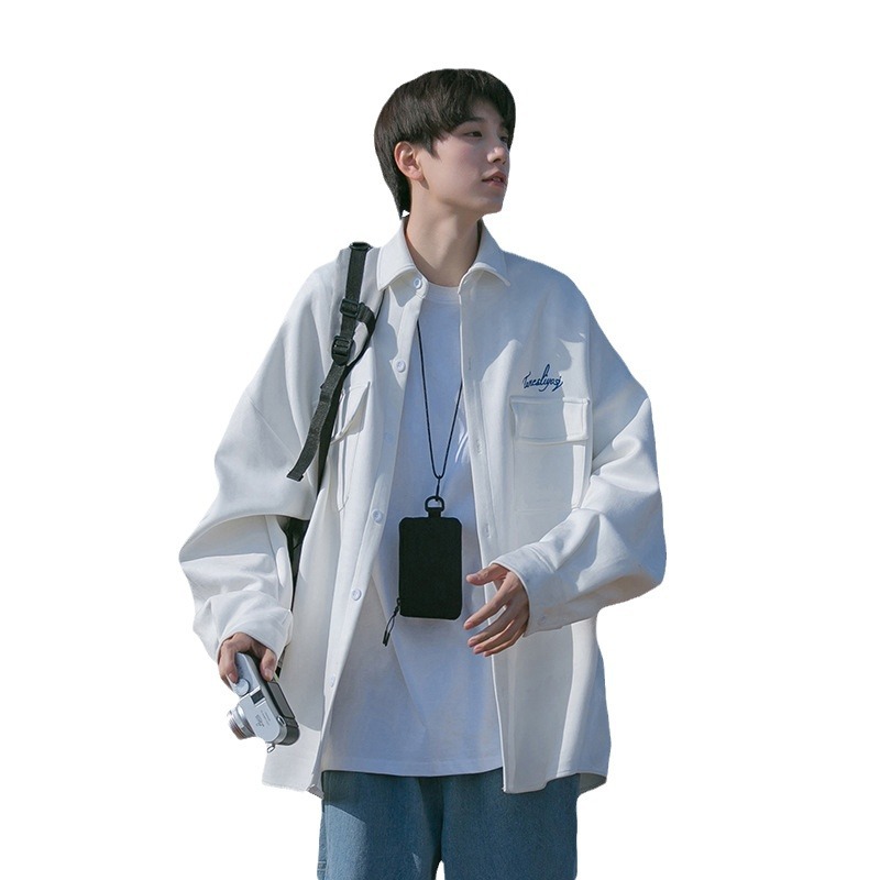 日系白色衬衫男长袖春秋新款麂皮绒刺绣外套潮牌ins宽松休闲衬衣