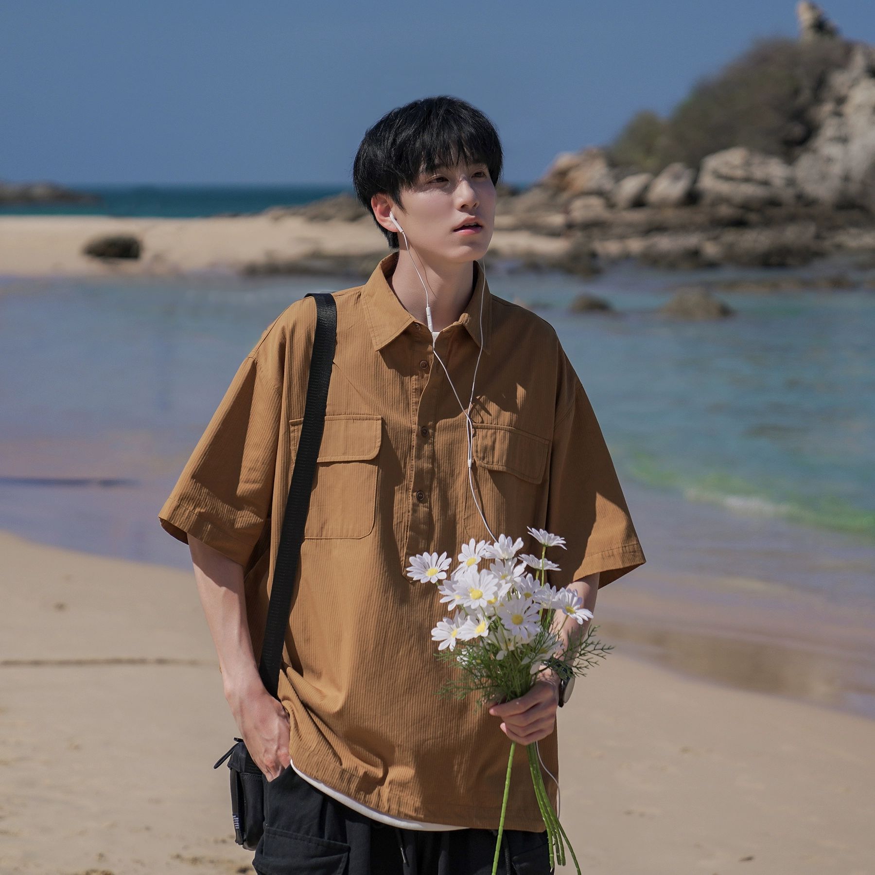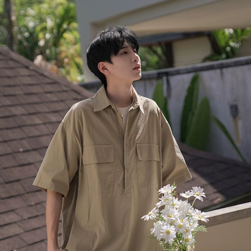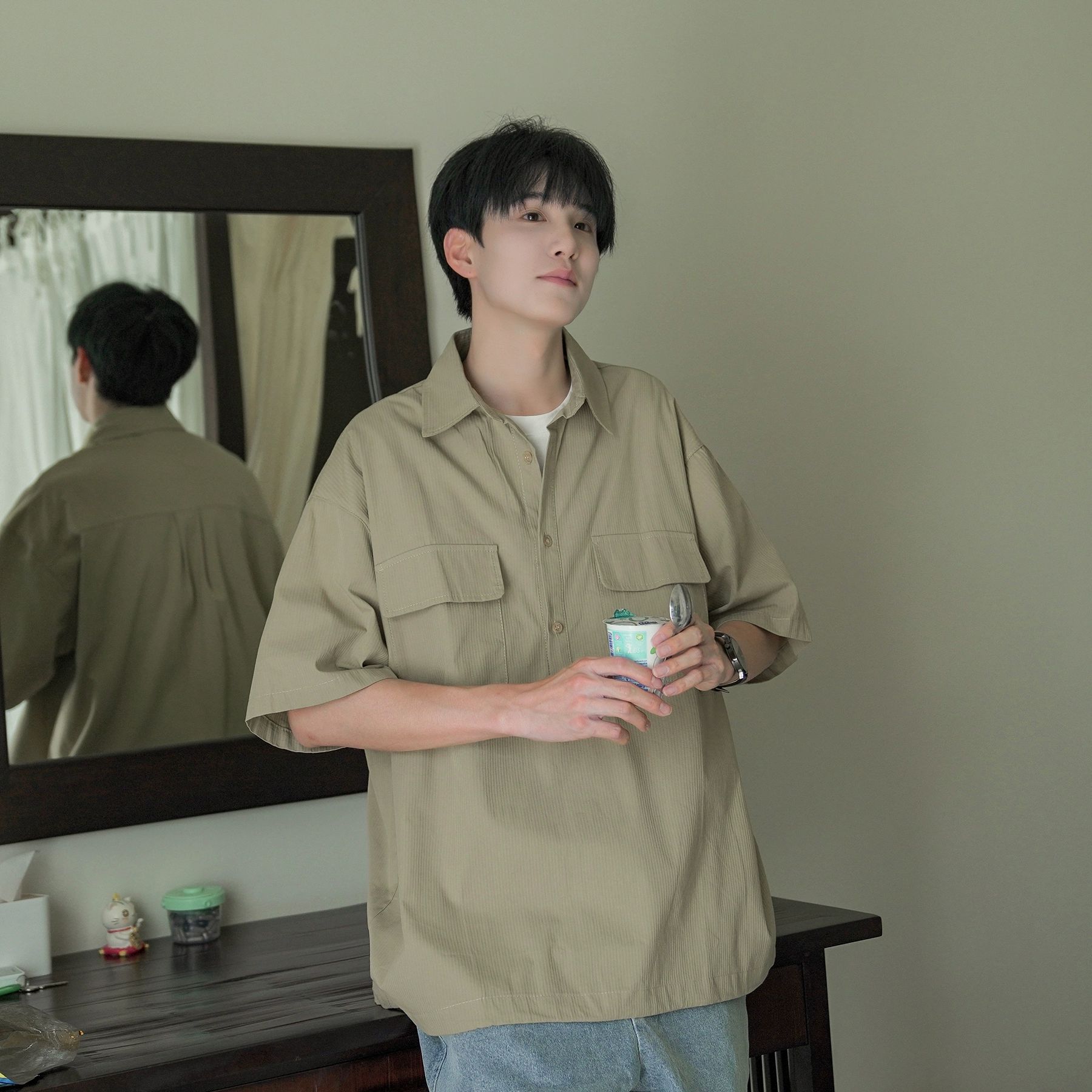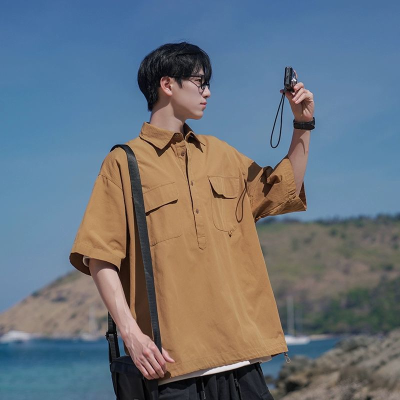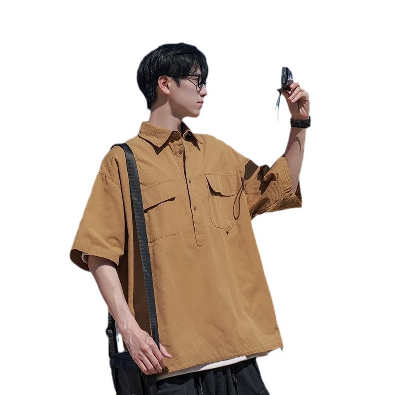 日系复古POLO衫男夏季潮牌设计感小众宽松休闲口袋衬衫领短袖t恤