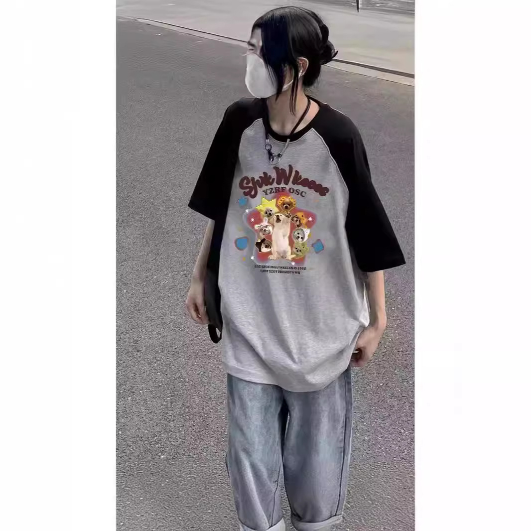 特大码纯棉美式复古正肩插肩袖t恤男女夏季宽松短袖半袖上衣服潮