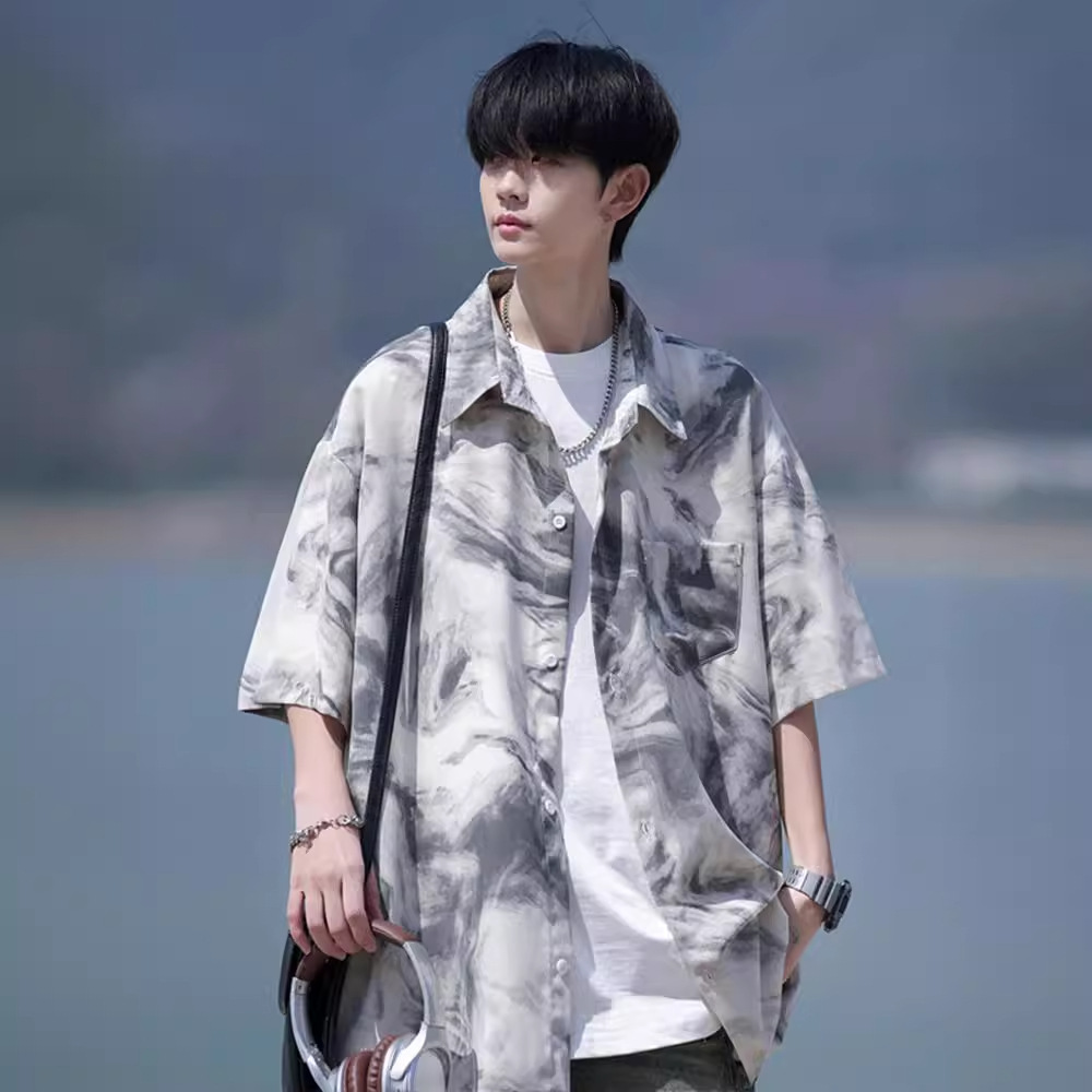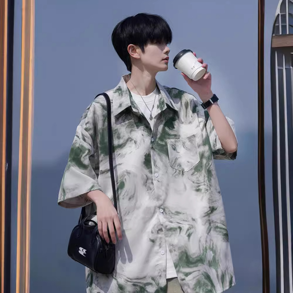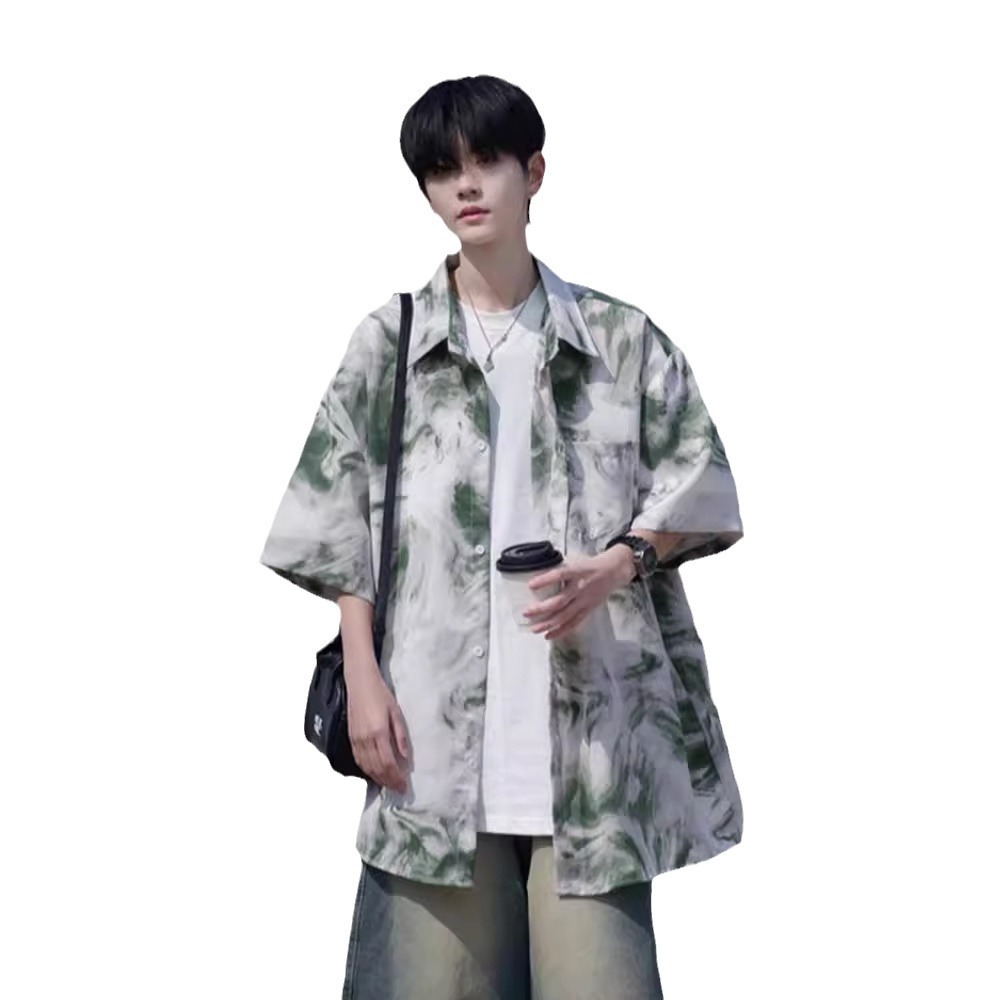 扎染短袖衬衫男士夏季冰丝海边花衬衣大码宽松潮牌外套沙滩七分袖