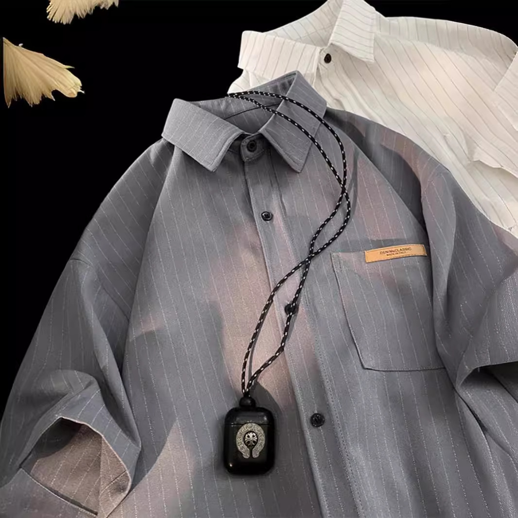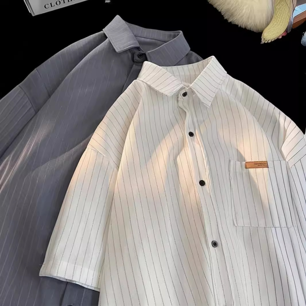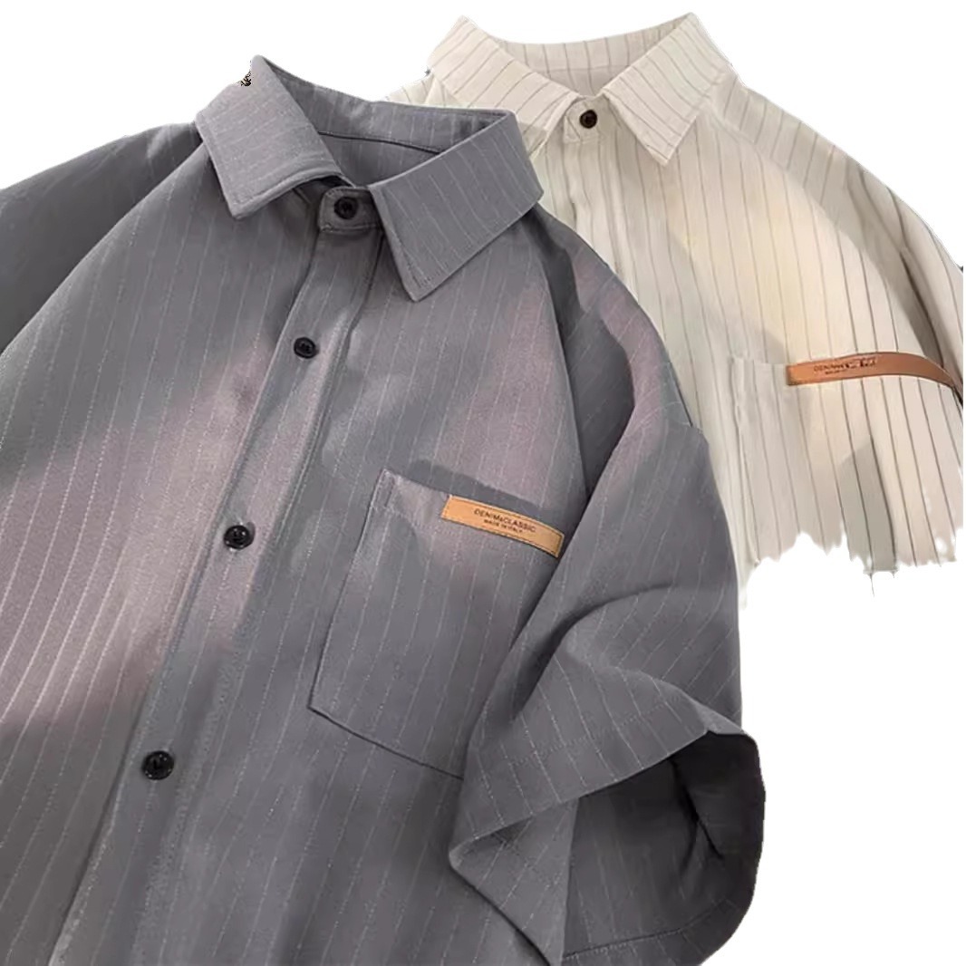 条纹冰丝衬衫男短袖夏天潮牌潮流百搭日系休闲大码衬衣半袖男款潮