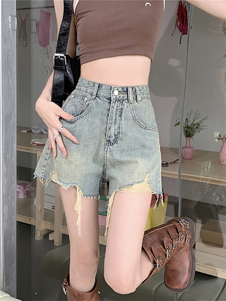 破洞牛仔短裤女春季春季新款复古高腰显瘦设计感A字阔腿裤子