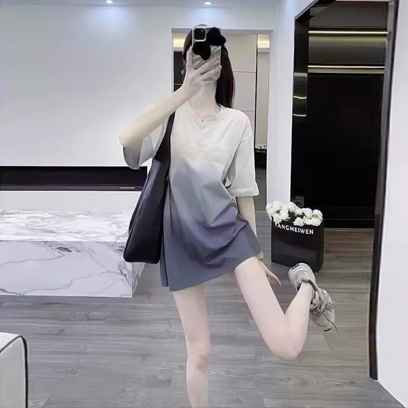 棉质渐变色夏季短袖t恤女2025新款爆款洋气时髦宽松慵懒风上衣潮