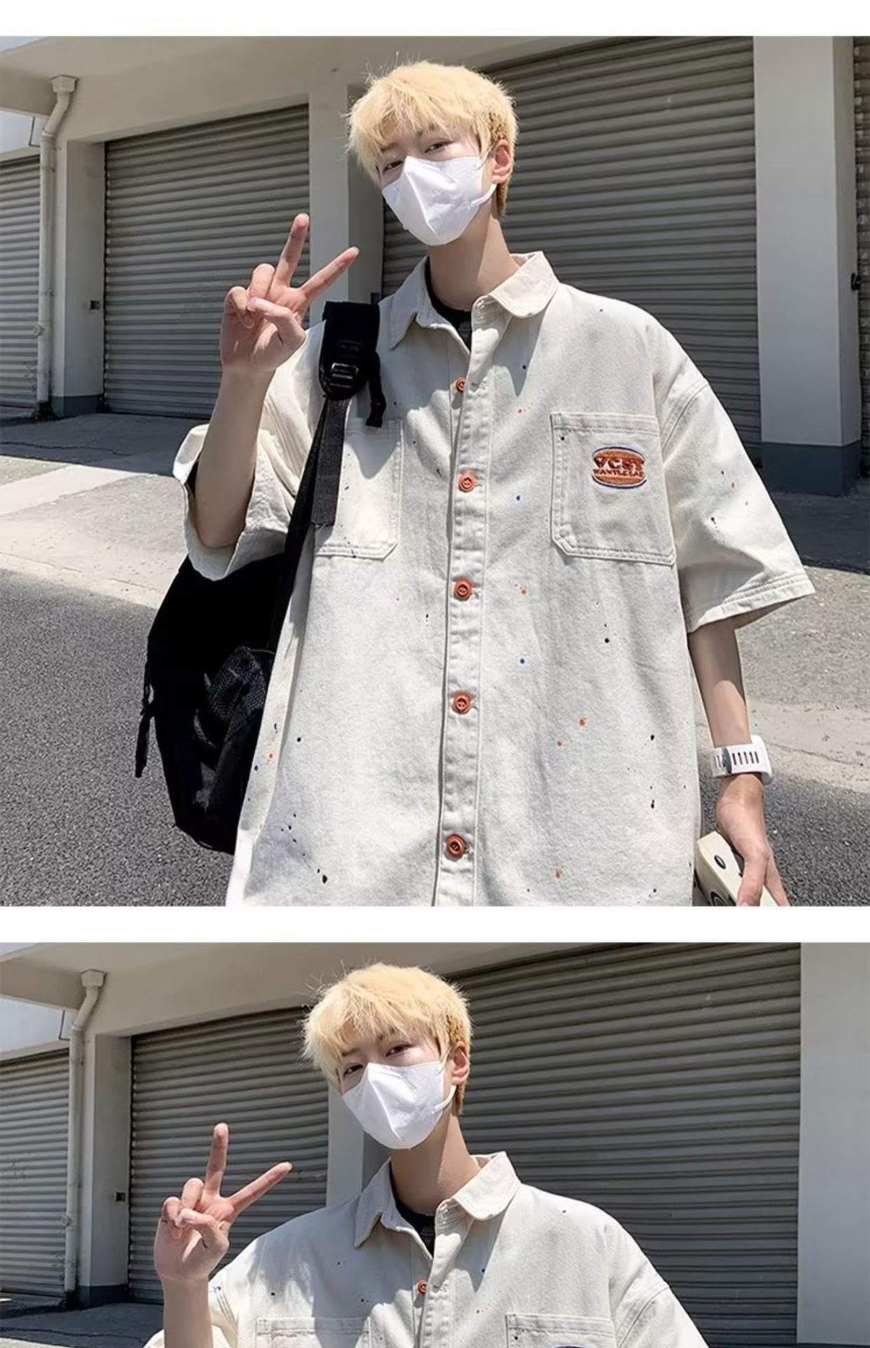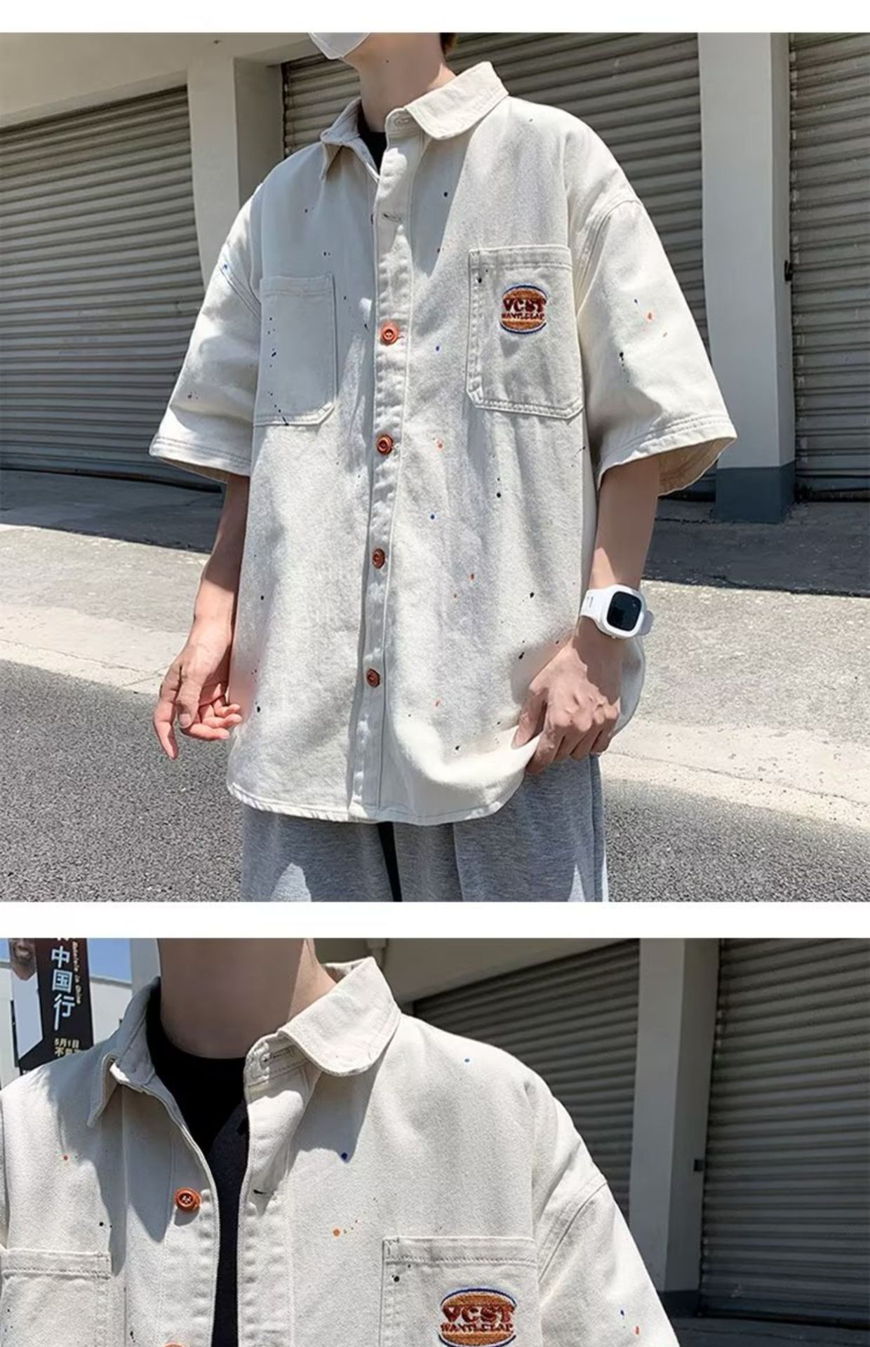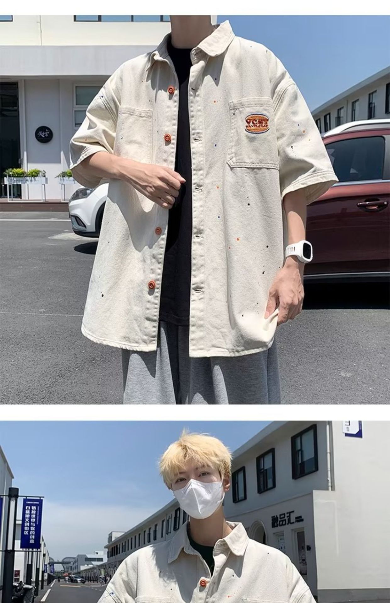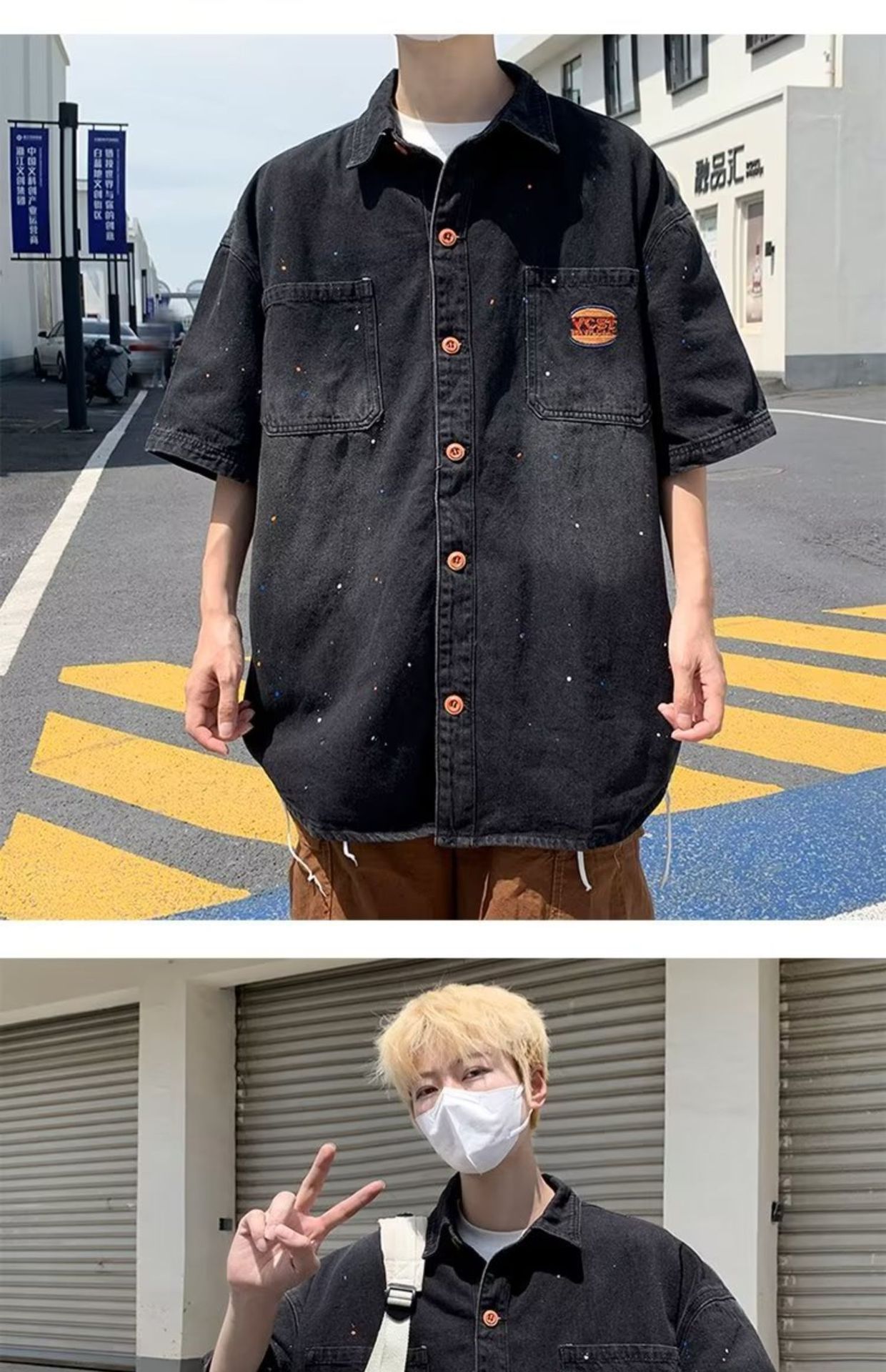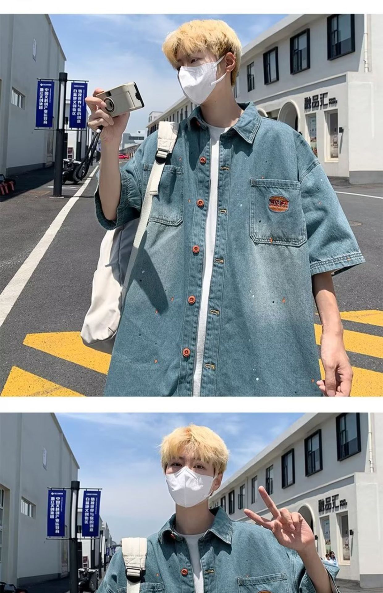 牛仔短袖衬衫男夏季薄款潮牌痞帅泼墨水洗宽松休闲五分袖衬衣外套