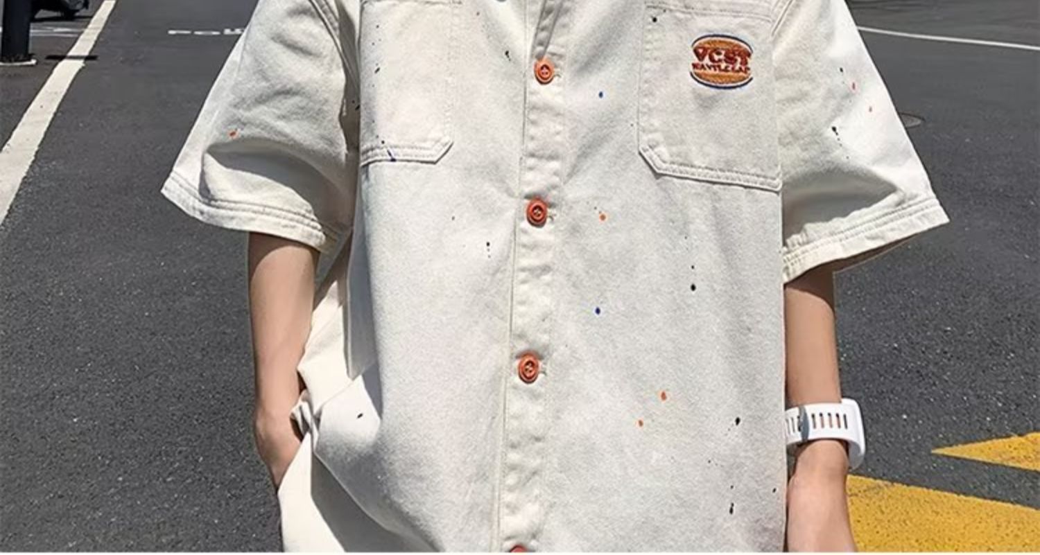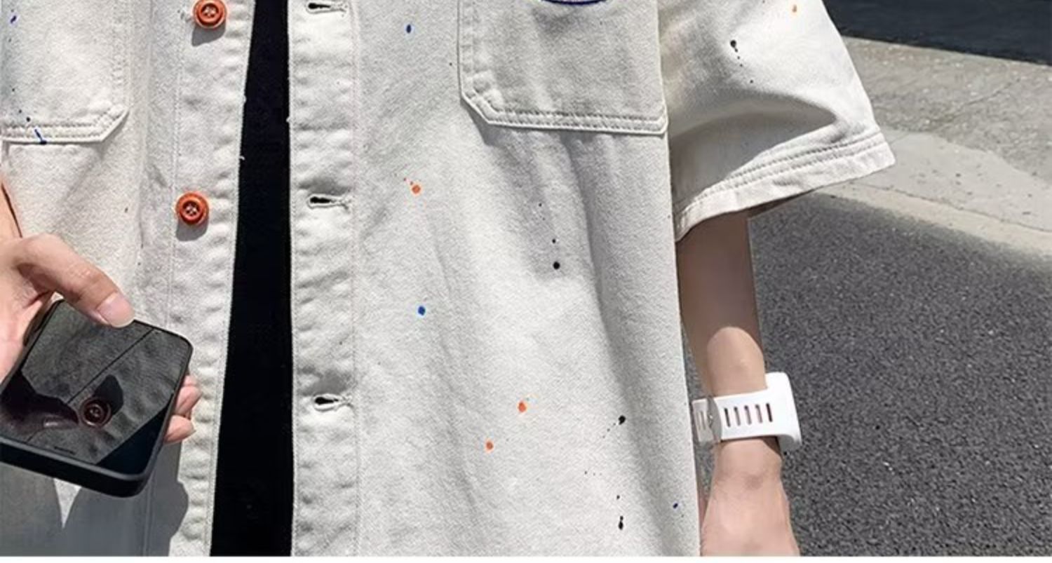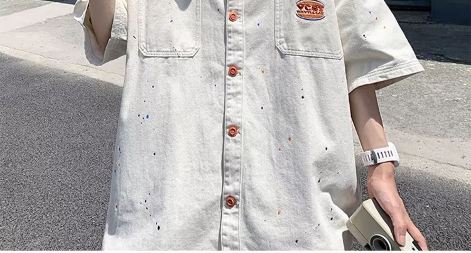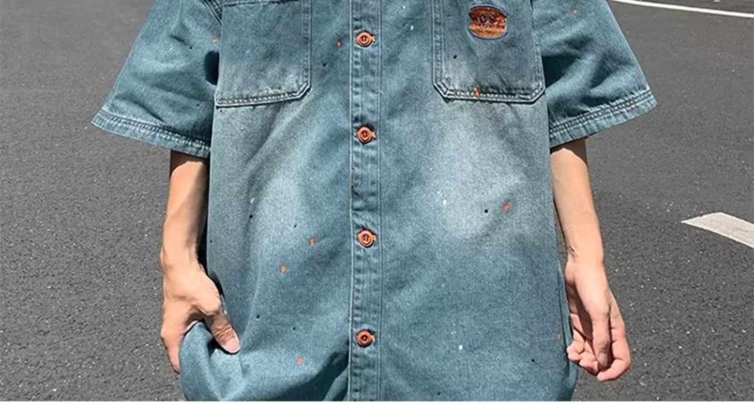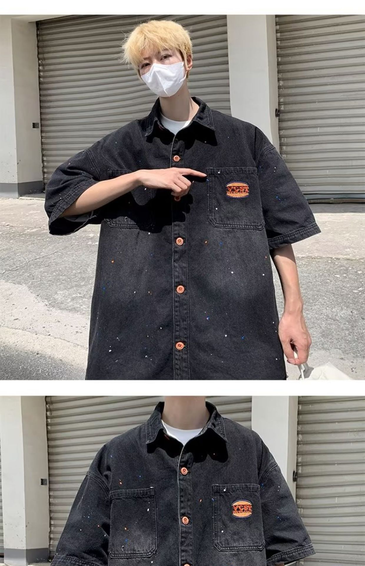 牛仔短袖衬衫男夏季薄款潮牌痞帅泼墨水洗宽松休闲五分袖衬衣外套