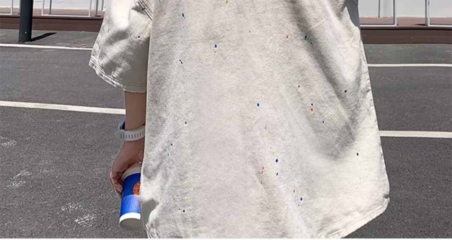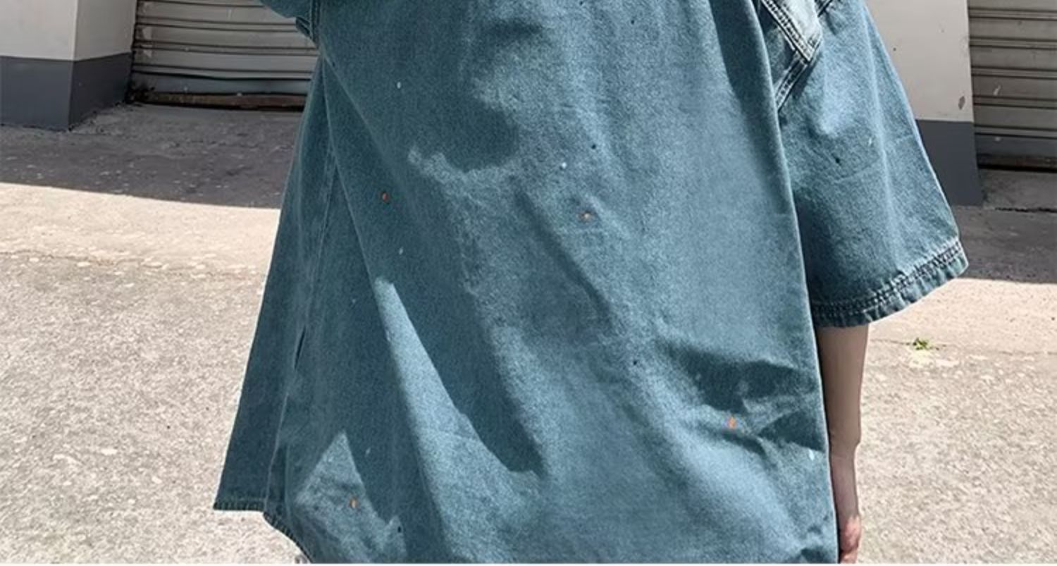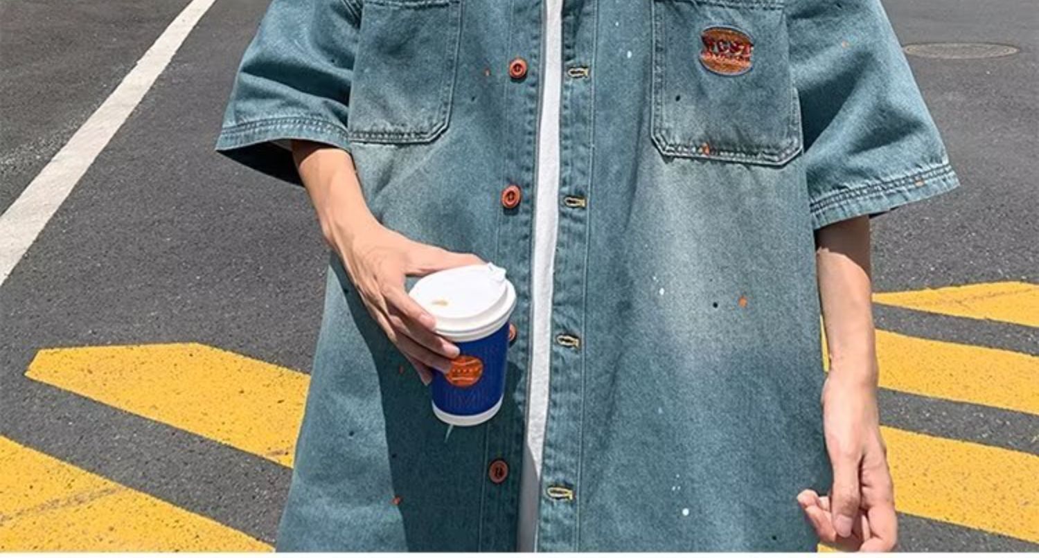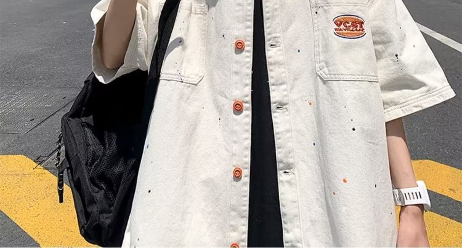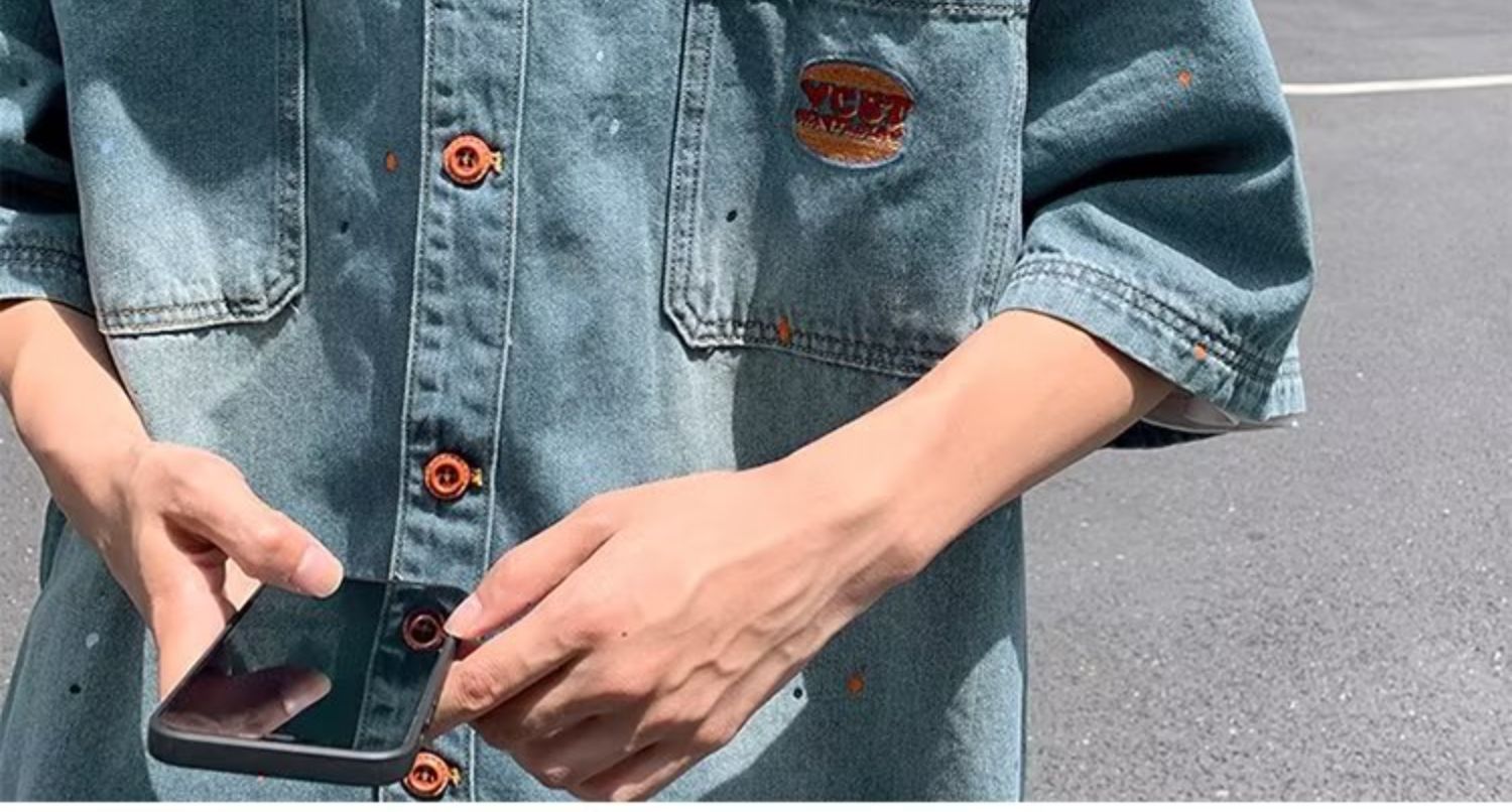 牛仔短袖衬衫男夏季薄款潮牌痞帅泼墨水洗宽松休闲五分袖衬衣外套