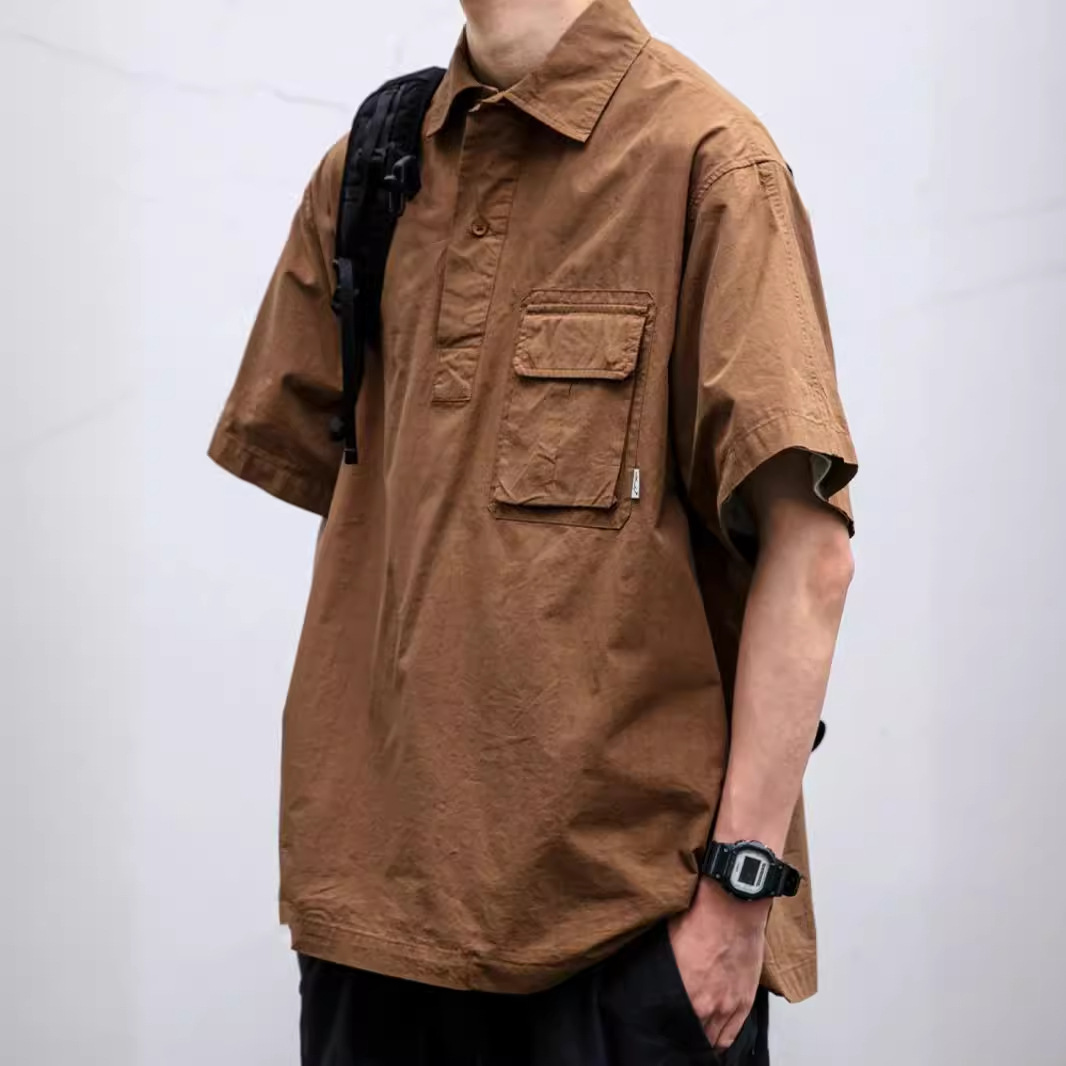 日系复古工装套头短袖衬衫男夏季潮牌户外潮流宽松休闲衬衣外套潮