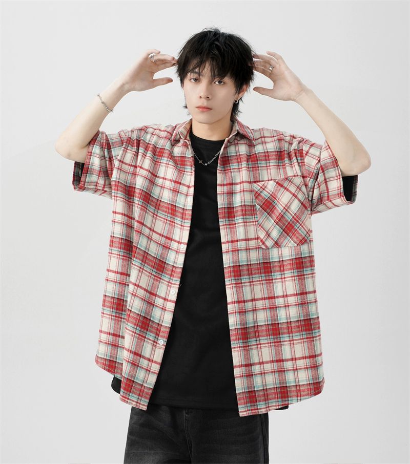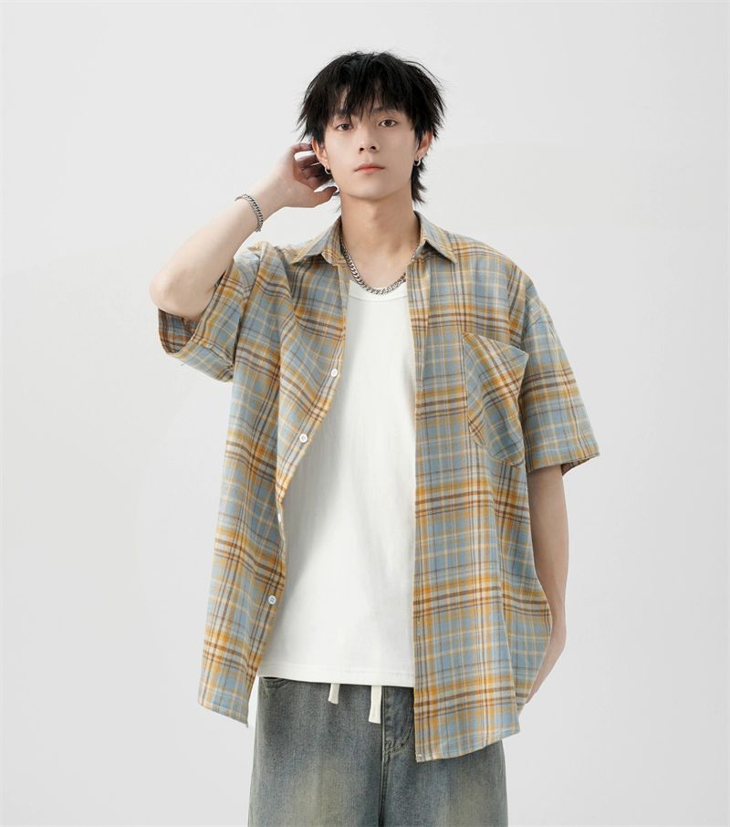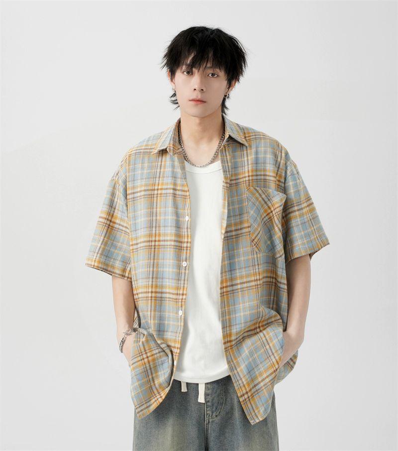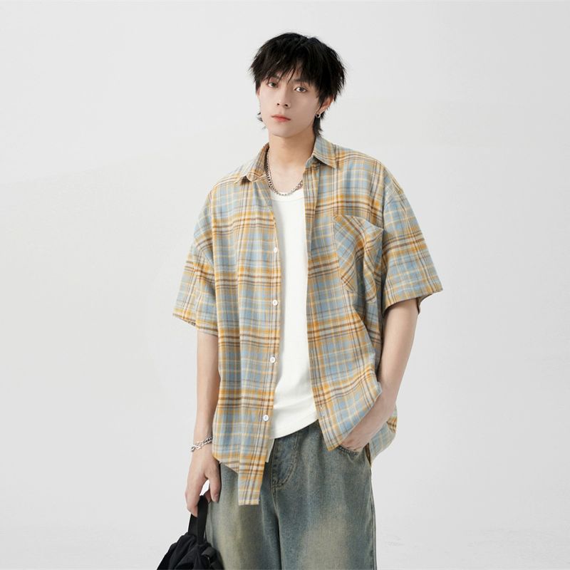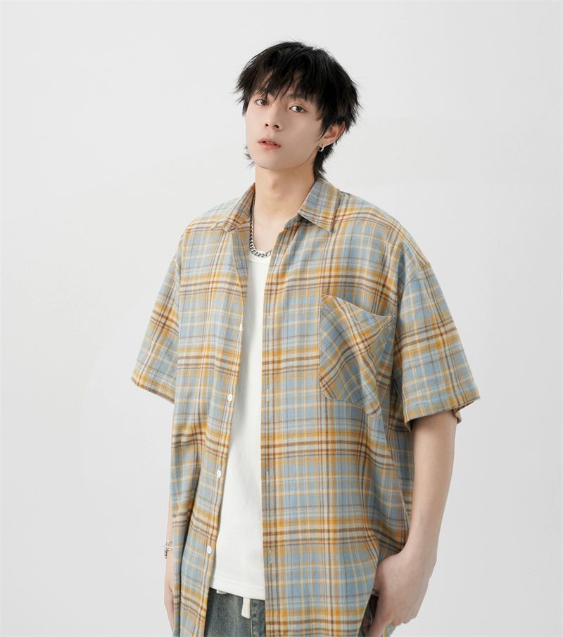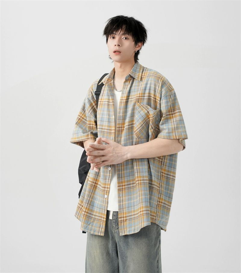 夏季日系中性格纹短袖衬衫男潮牌宽松半袖衬衣百搭情侣男格子