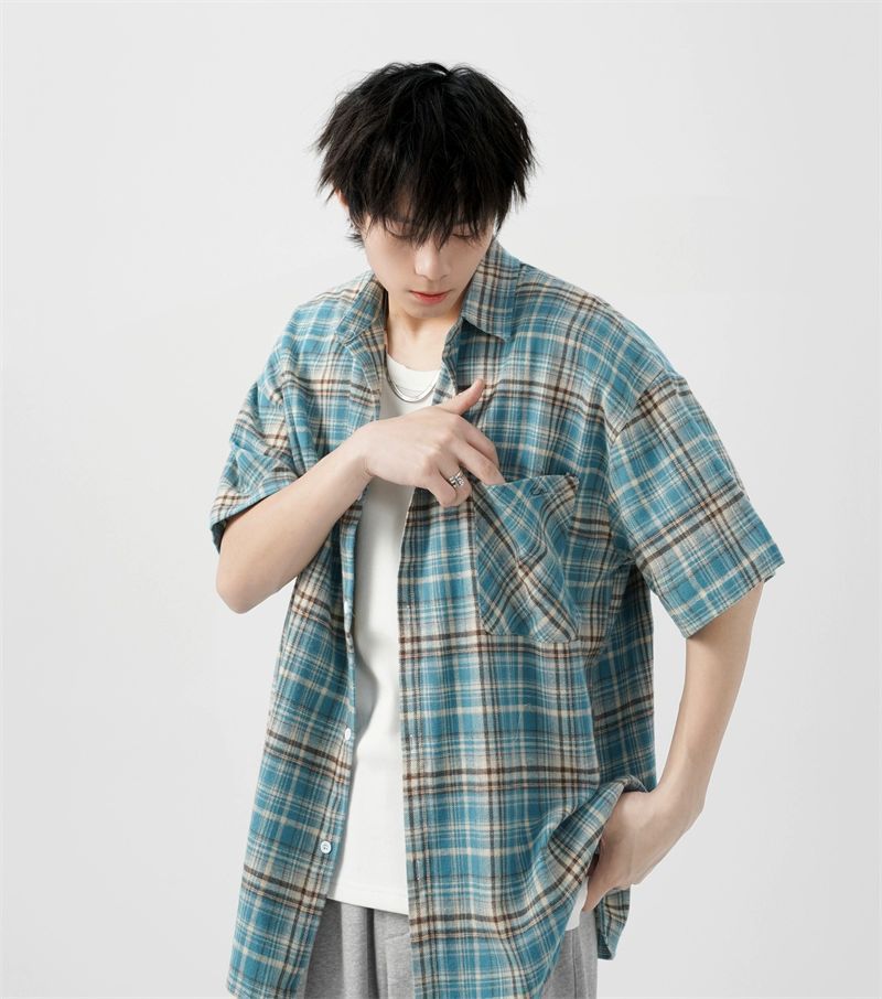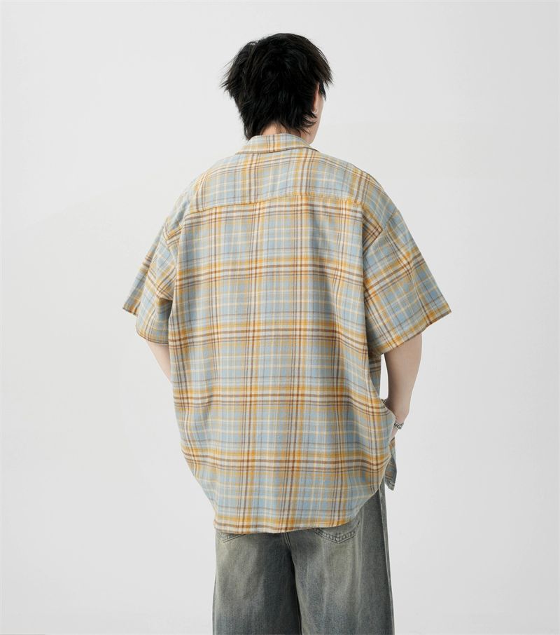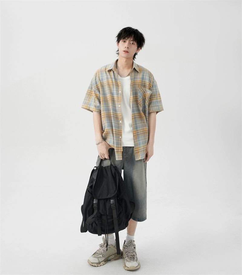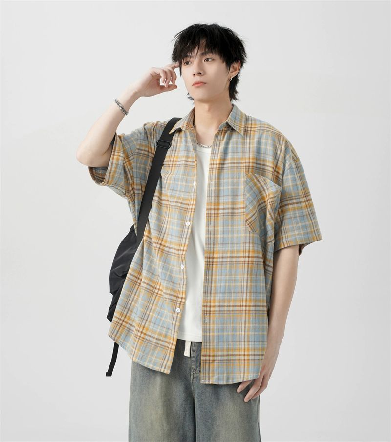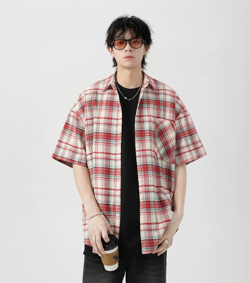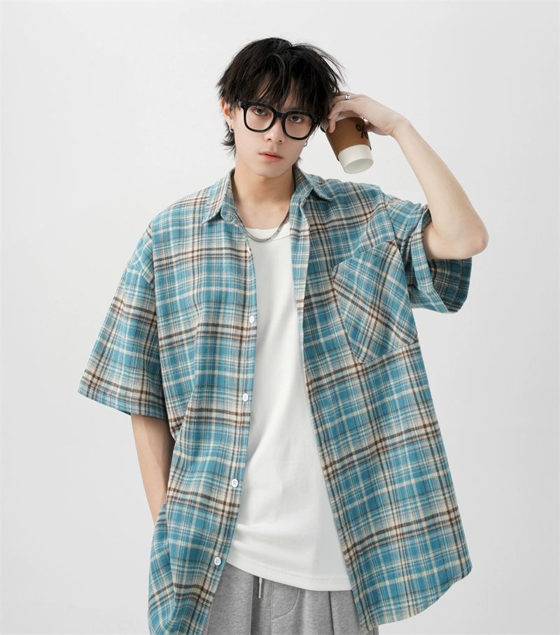 夏季日系中性格纹短袖衬衫男潮牌宽松半袖衬衣百搭情侣男格子