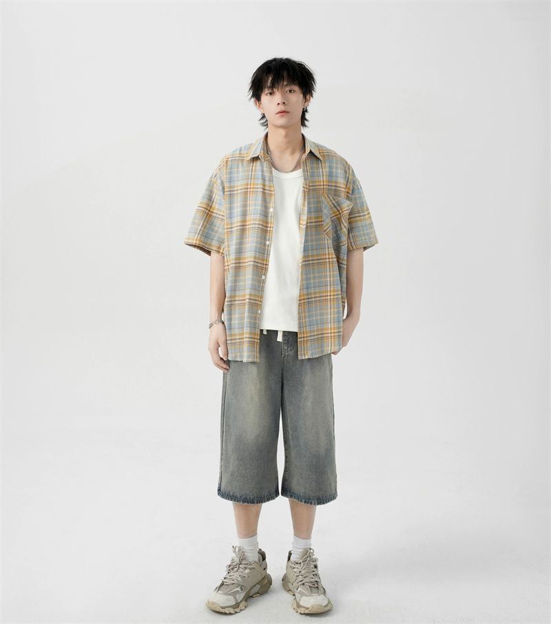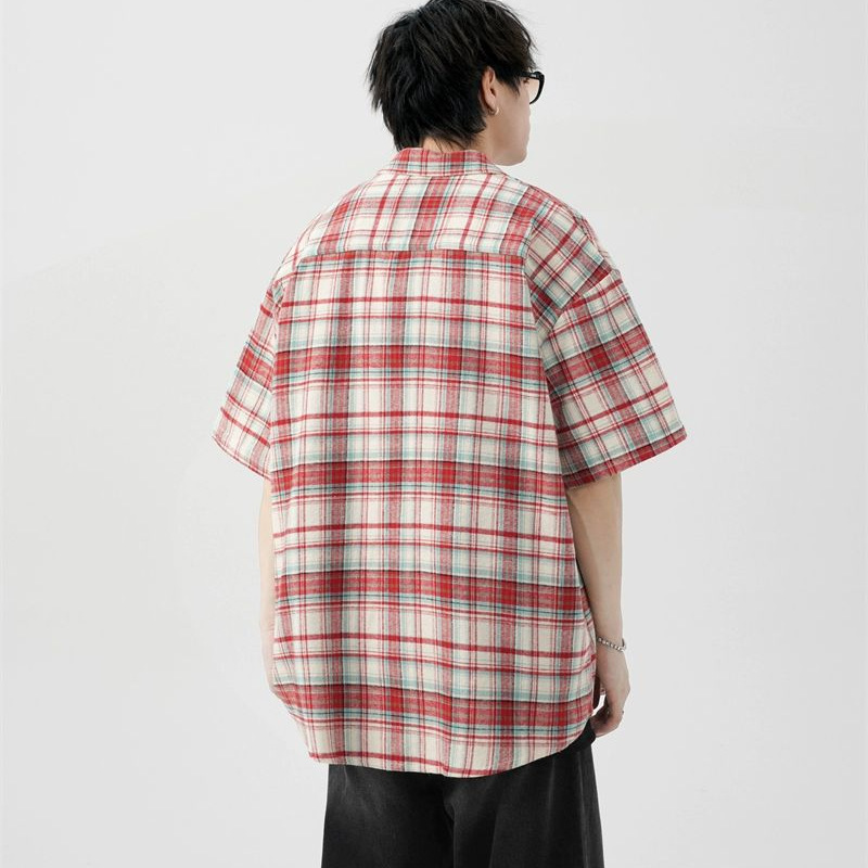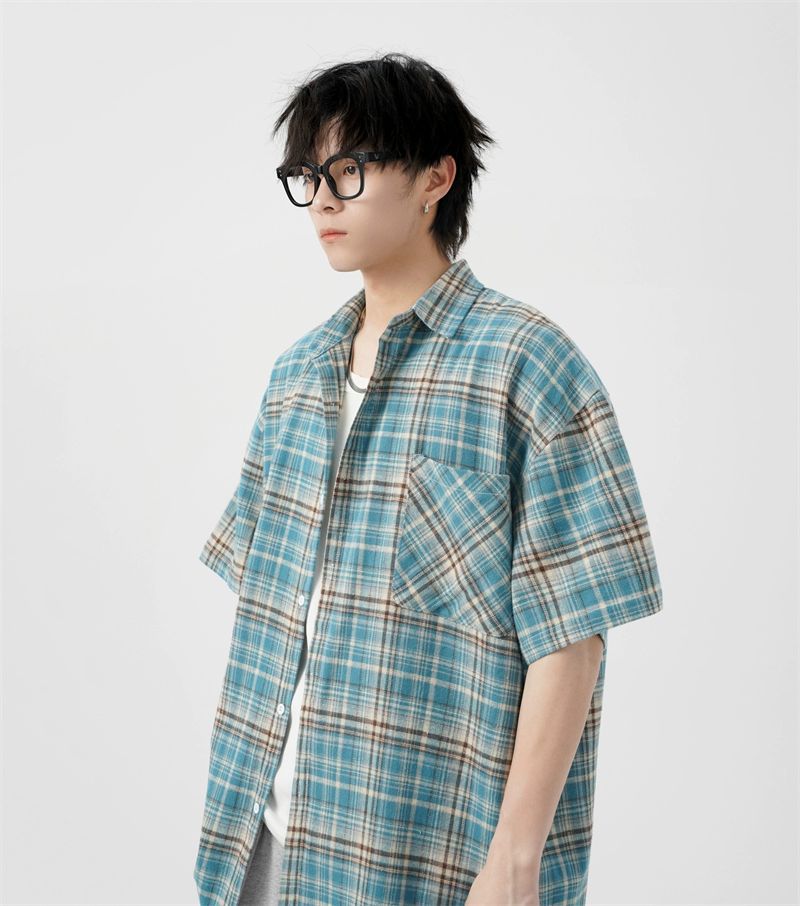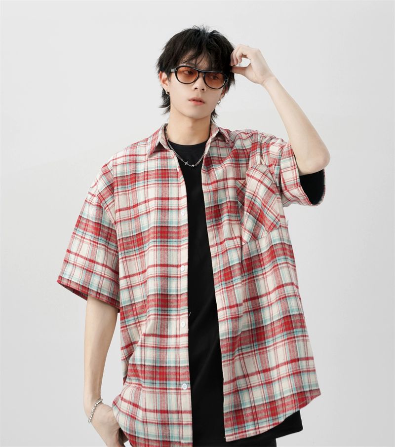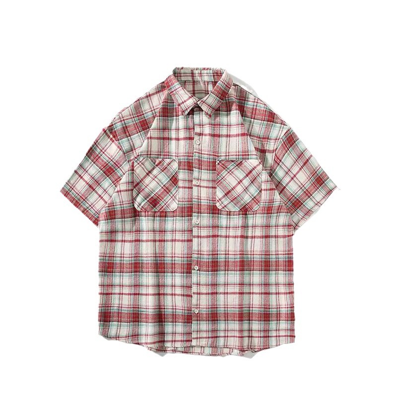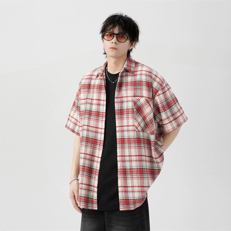 夏季日系中性格纹短袖衬衫男潮牌宽松半袖衬衣百搭情侣男格子