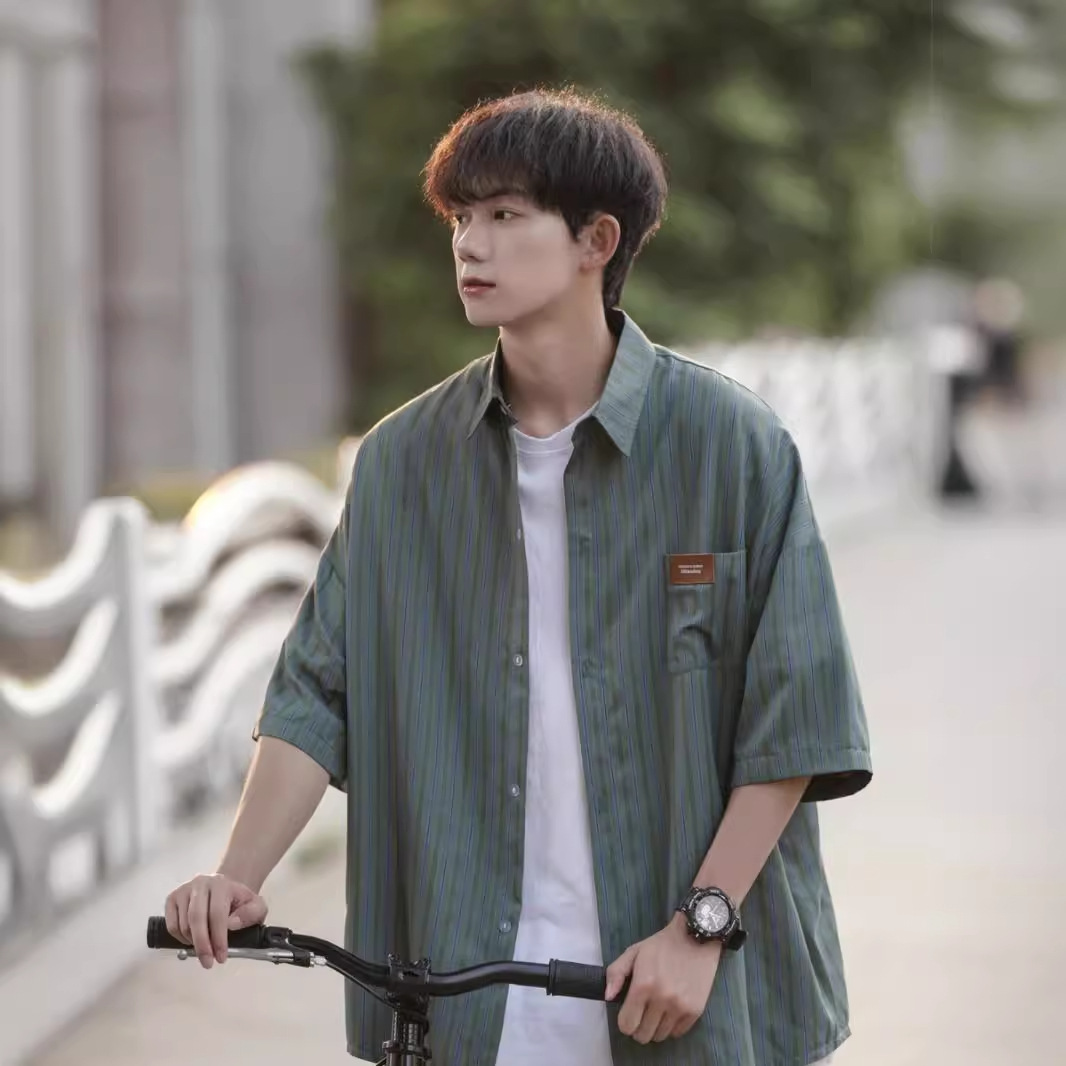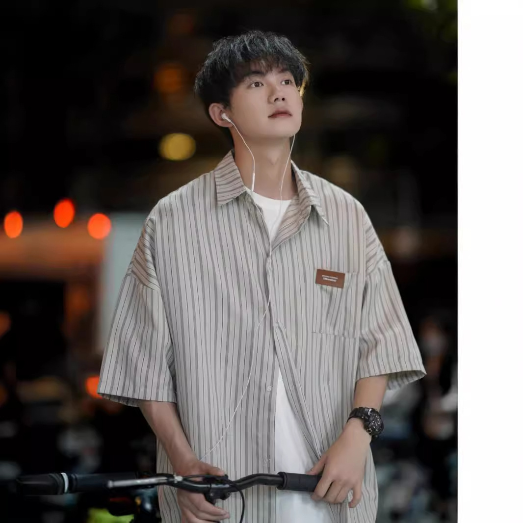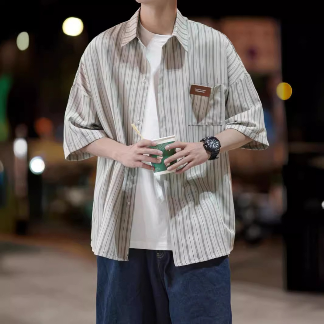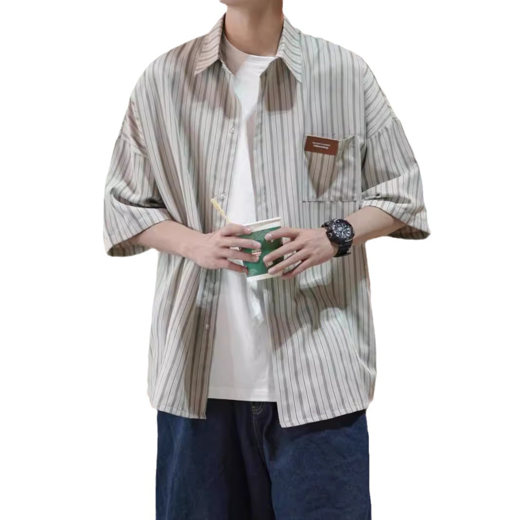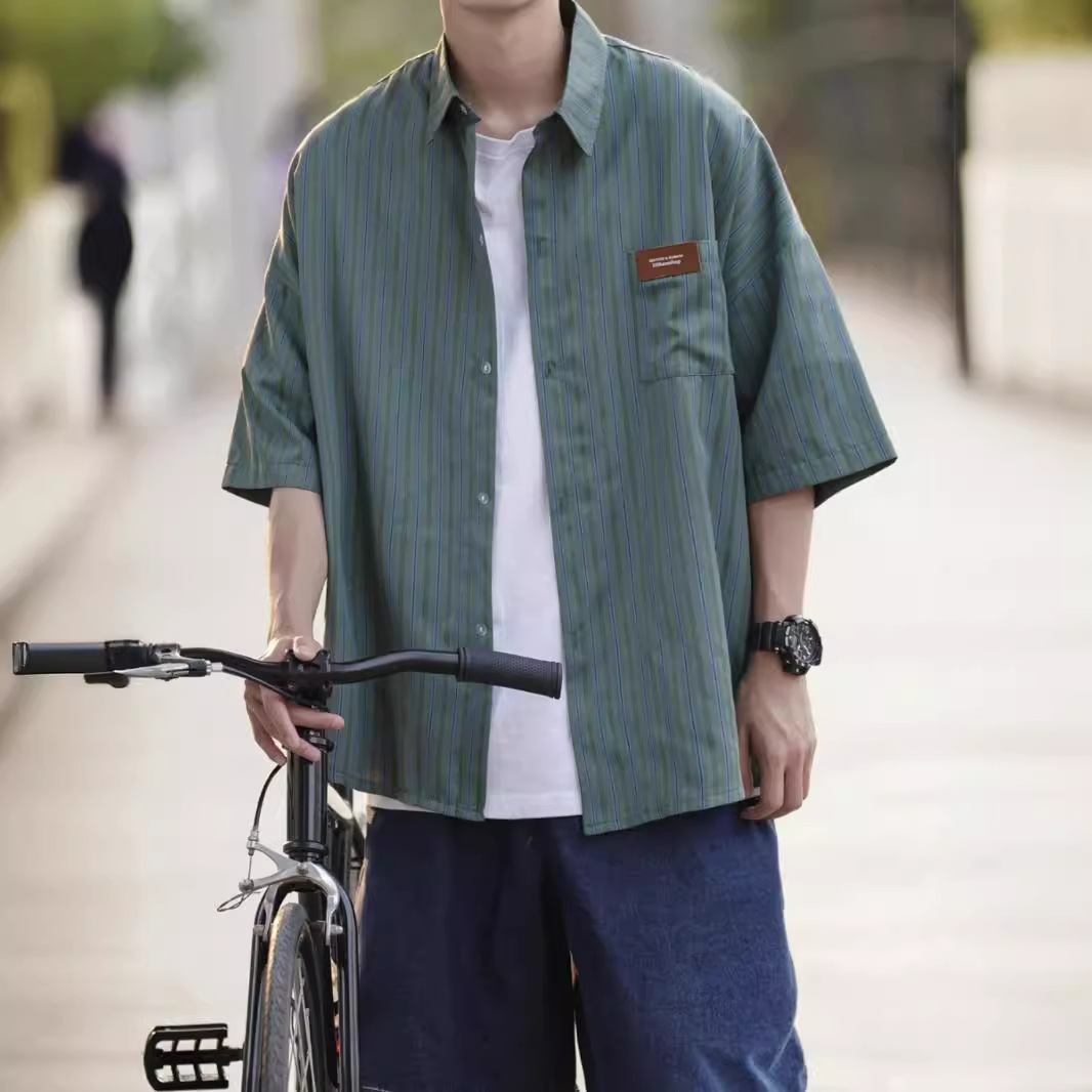 痞帅衬衫短袖男士夏季潮牌潮流新款设计感小众条纹七分袖衬衣