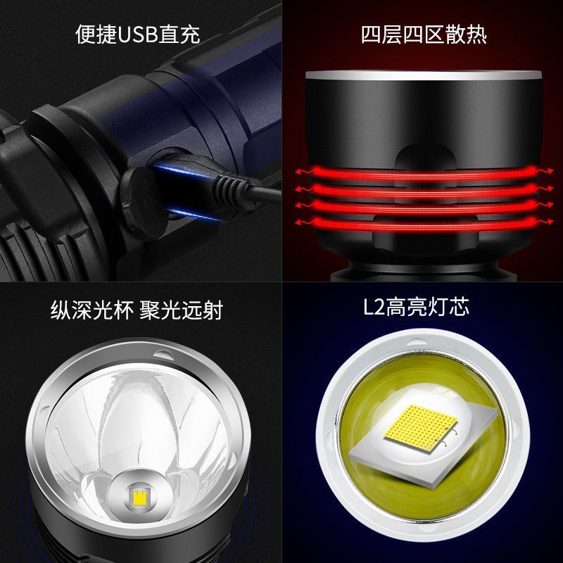 强光可充电手电筒超亮远射LED户外家用超亮探照灯大功率手电筒