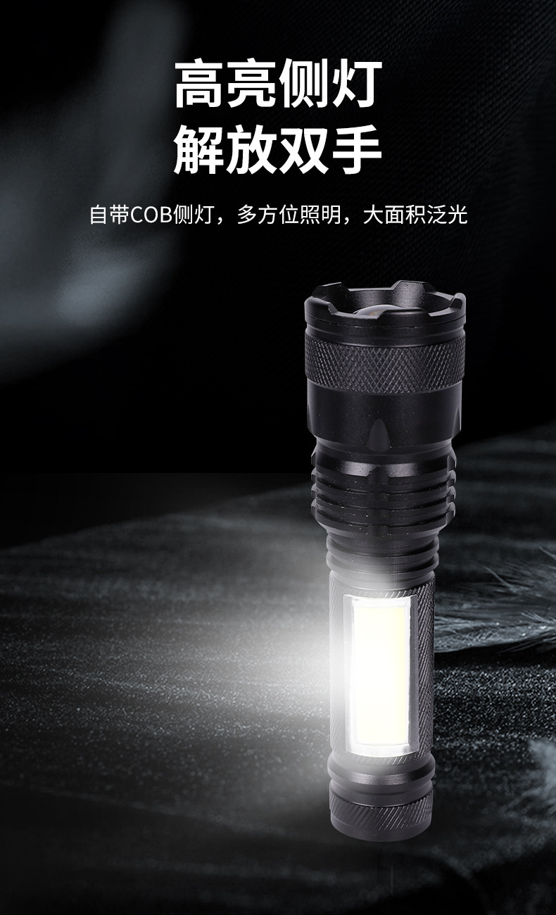 新款白激光强光手电筒 户外照明伸缩变焦多功能COB侧灯手电筒