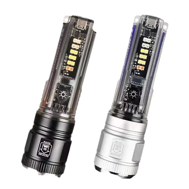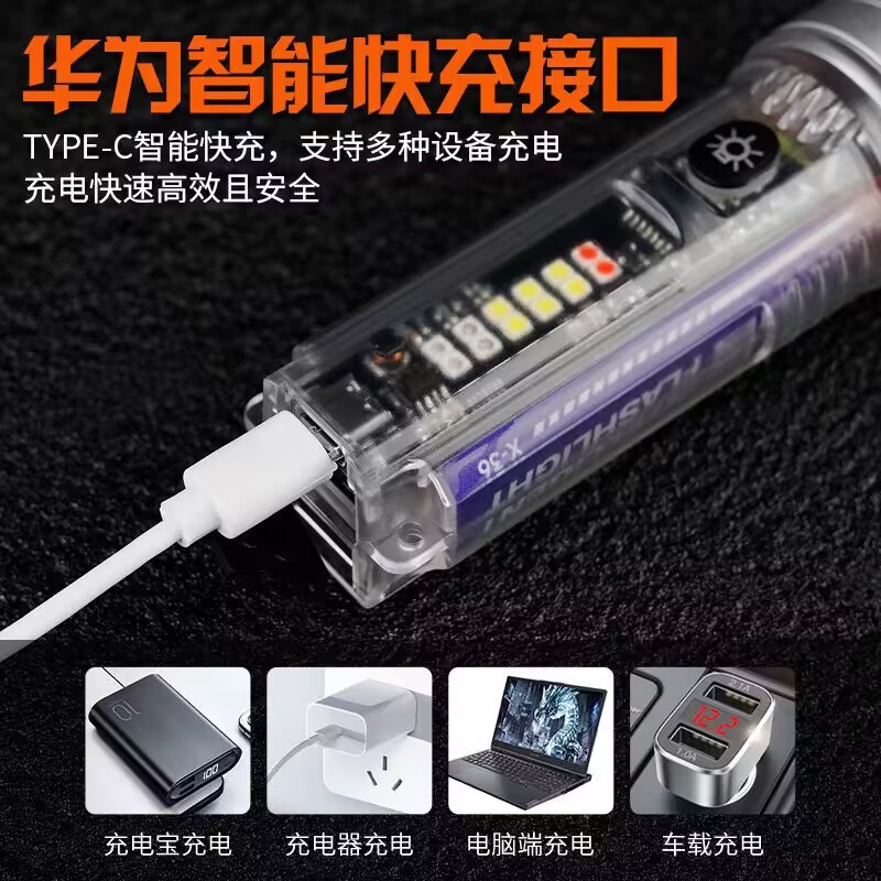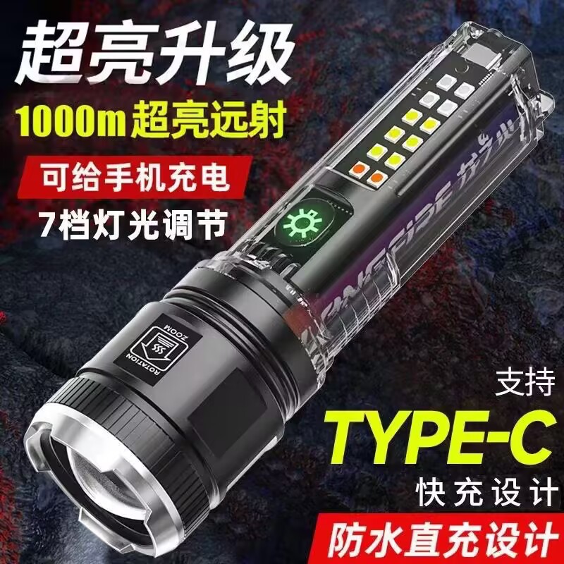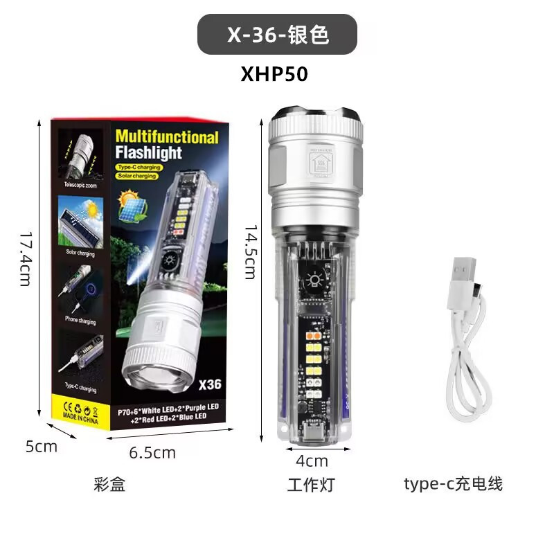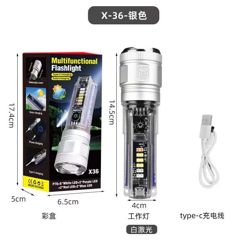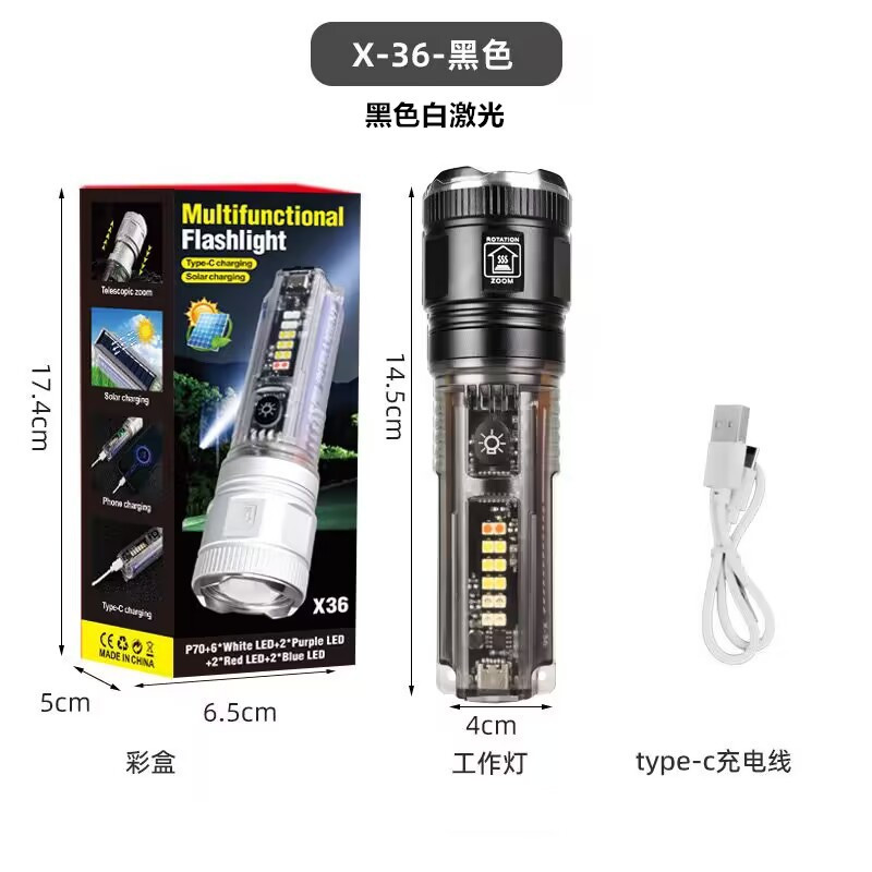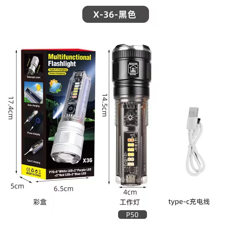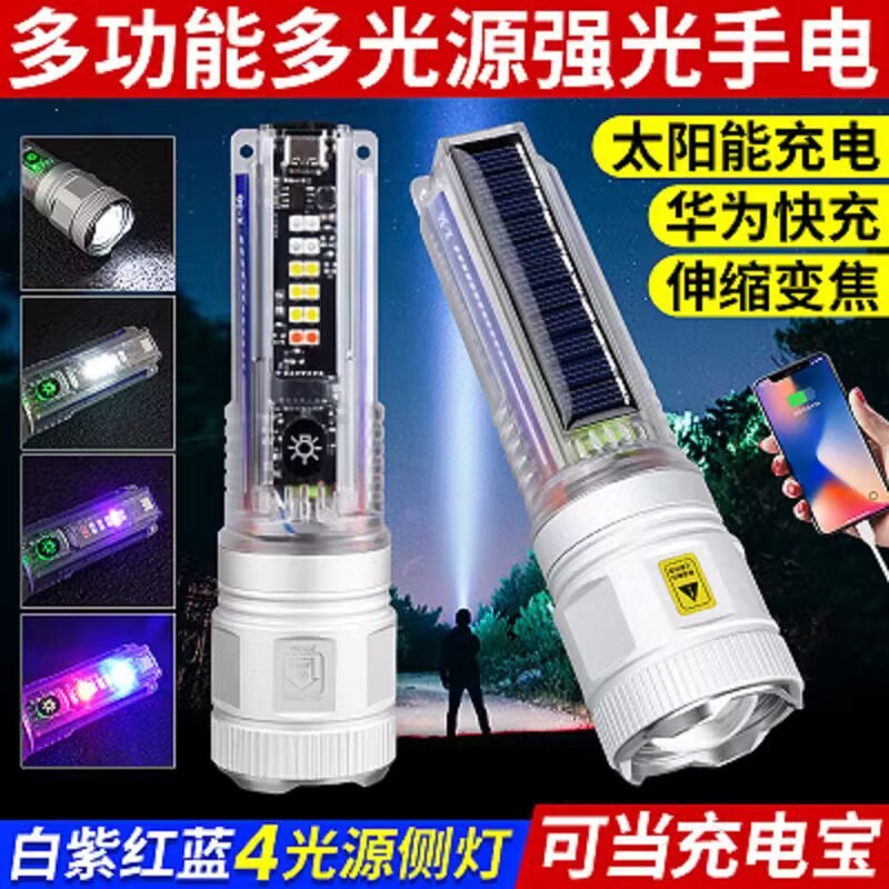 户外多功能便携可充电手电筒强光变焦太阳能警示灯超亮远射灯