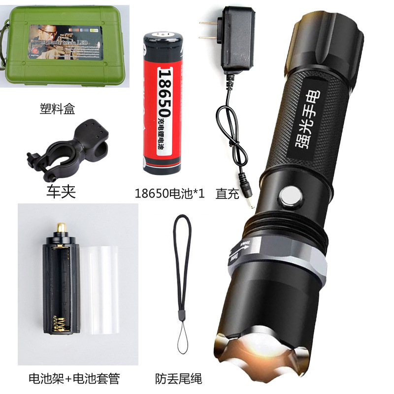 手电筒+1节18650+充电器+塑料盒子+车夹