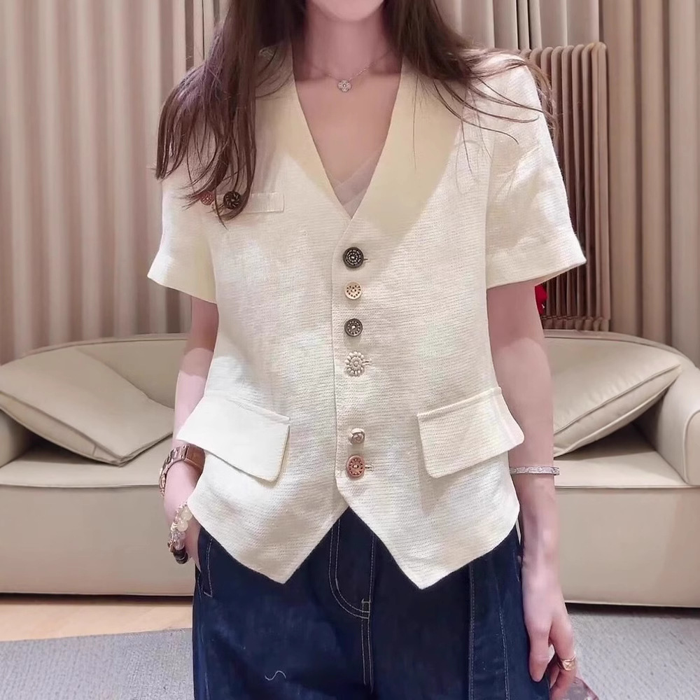 法式复古小香风V领短袖衬衫女夏季新款高端设计感休闲上衣