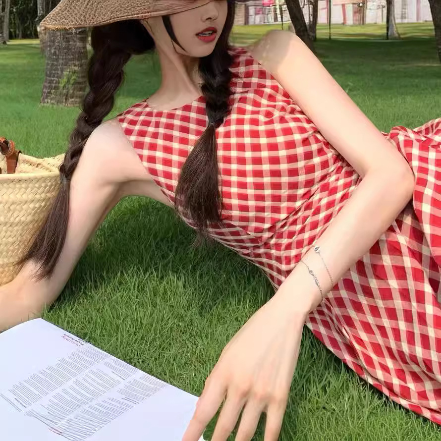 温柔无袖红色格子连衣裙女新款收腰显瘦背心短裙