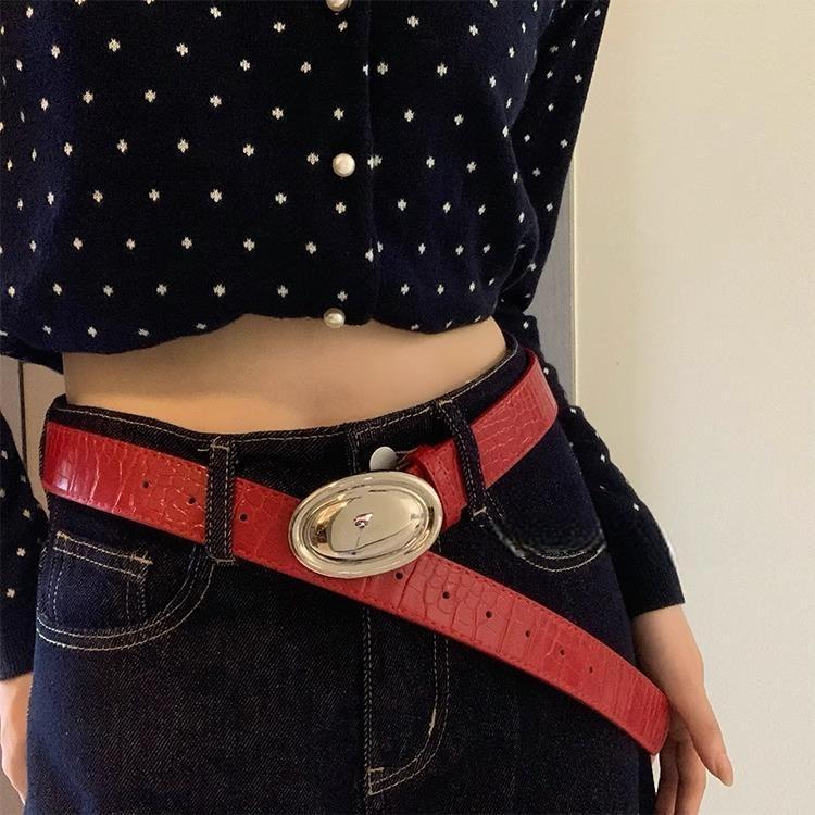 简约椭圆时尚显眼红色四季百搭休闲辣妹腰带简约银色扣高级感皮带