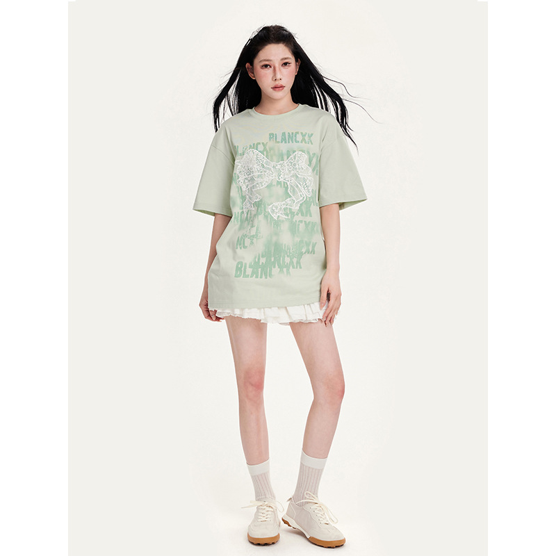 夏季新款实拍宽松美式可爱有趣蕾丝短袖T恤