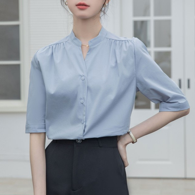 蓝色纯色立领五分袖衬衫女夏季中袖职业衬衣气质通勤面试上衣