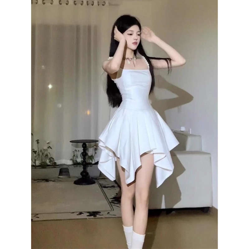 法式白色珍珠吊带连衣裙女夏季收腰显瘦不规则生日公主蓬蓬短裙子