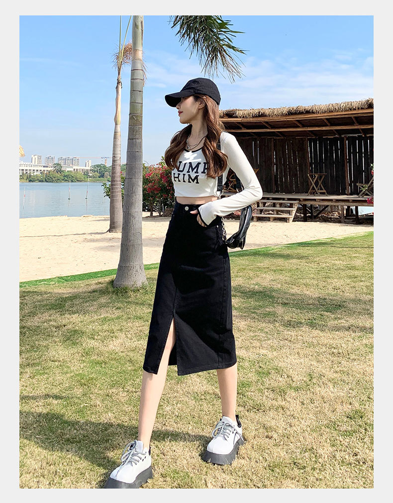 2025年春夏新款开叉黑色牛仔半身裙女直筒中长款高腰显瘦a字包臀