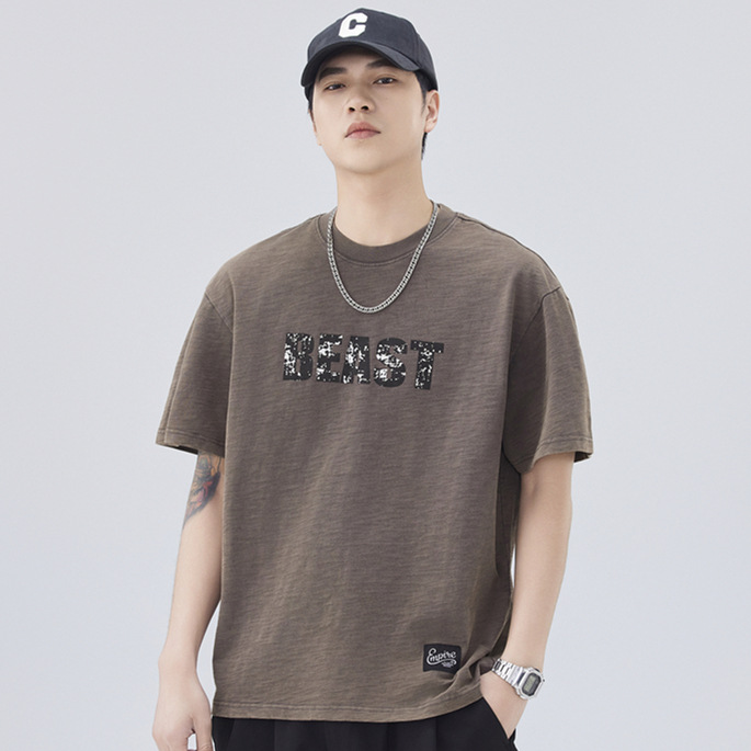 250g夏季新款圆领短袖T恤男炒洗布字母印花车标宽松休闲半袖上衣