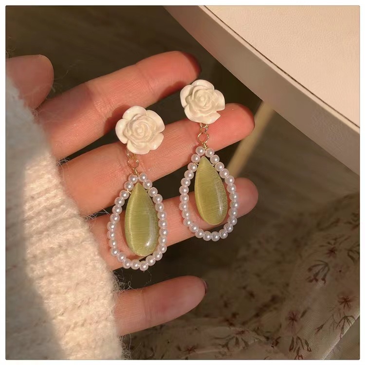 法式复古绿色 猫眼石耳钉~温柔珍珠山茶花玫瑰水滴耳环女夏季耳夹