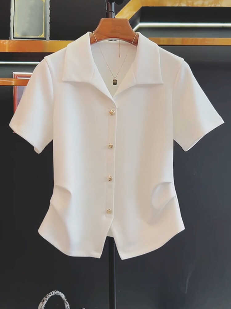 大码胖mm短袖白色T恤女减龄气质女褶皱修身显瘦纽扣polo翻领上衣